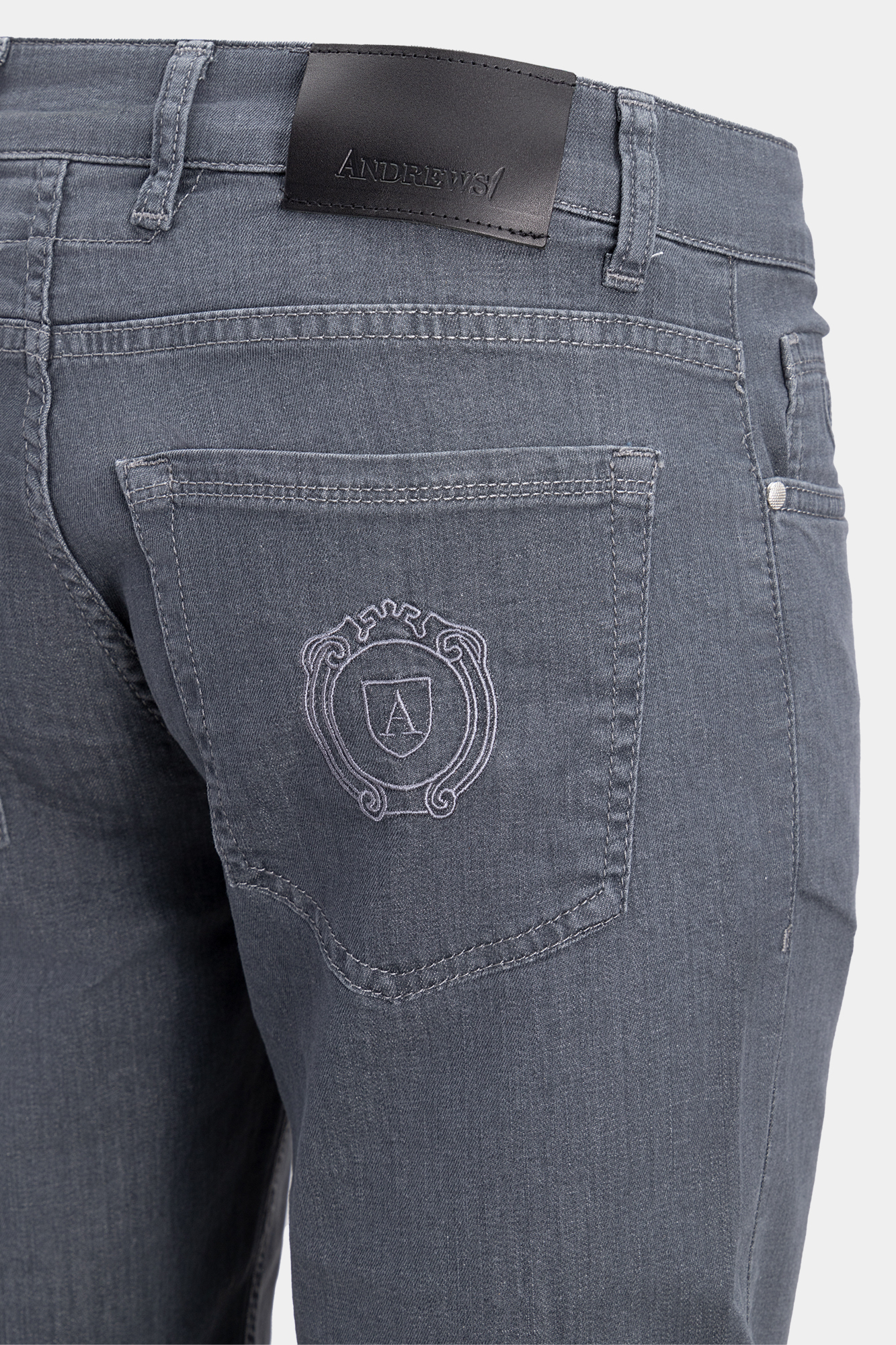 Сиви дънки с бродерия лого на задния джоб. Вталена кройка. Кожена емблема в задната част на талията. Подходящи за сезон пролет / лято. Състав : 98 % памук, 2 % еластан.