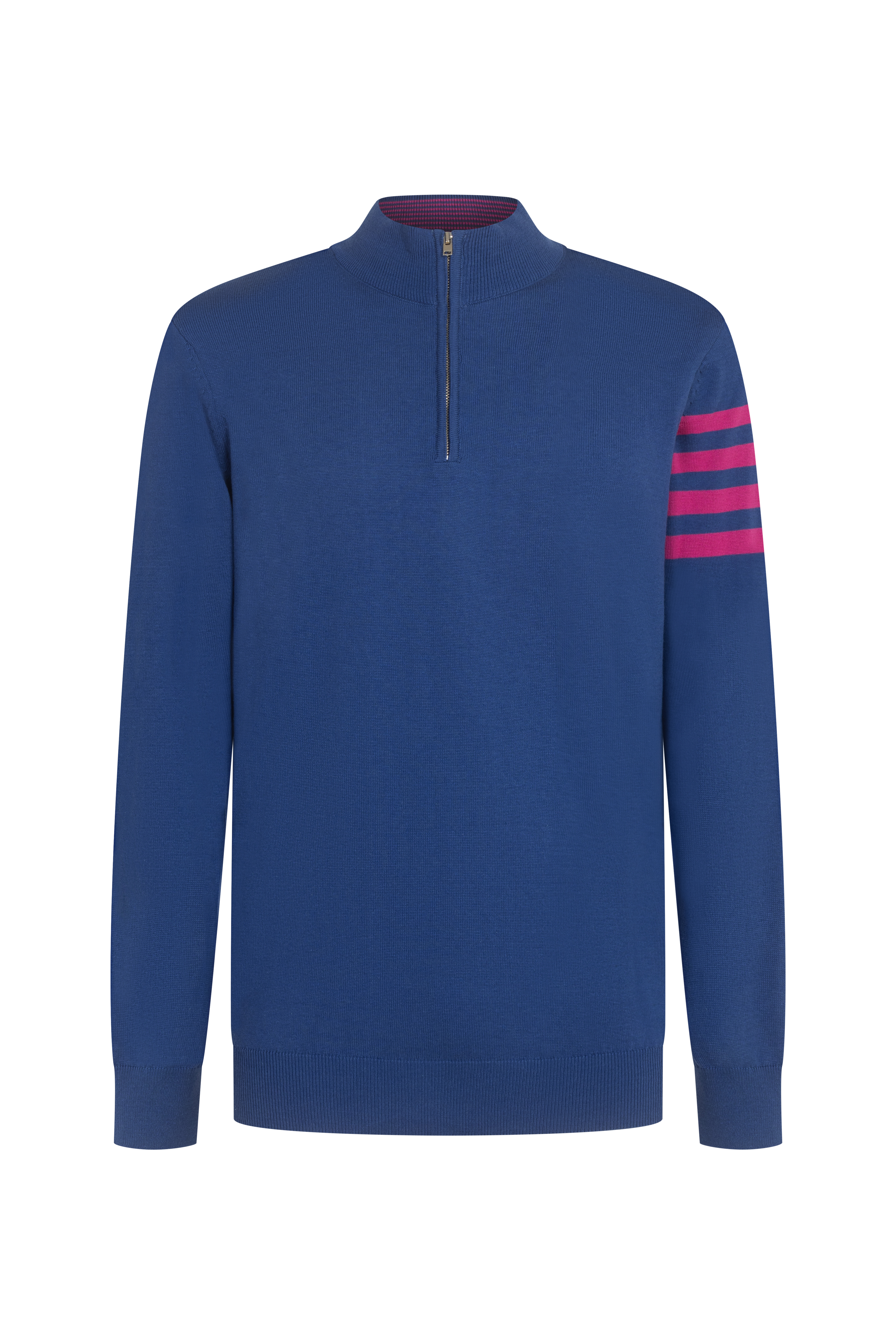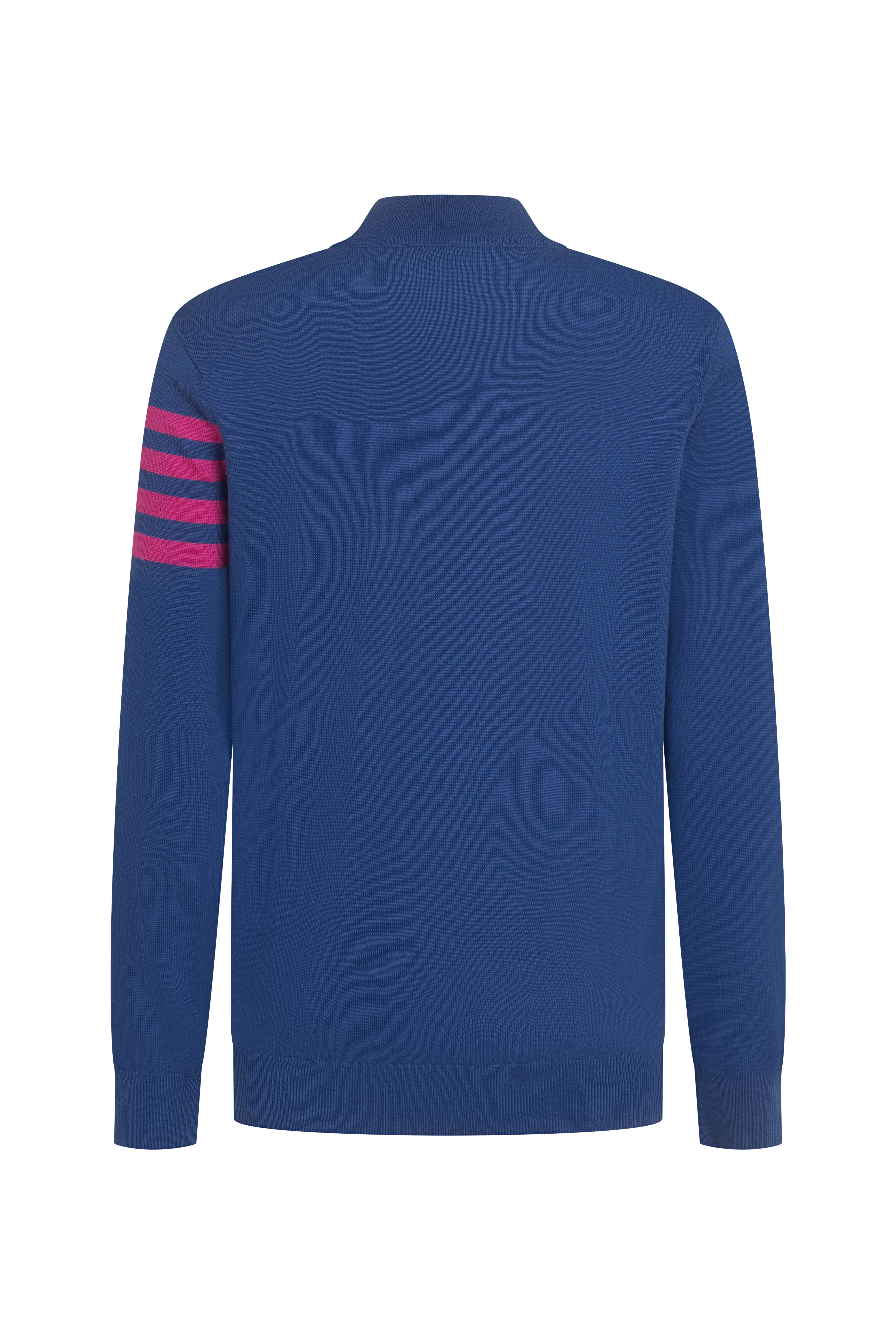 Спортно-елегантен пуловер в син цвят с контрастни розови ленти на ръкава. Моделът е с къс цип и висока яка за удобство и стил. Перфектен избор за ежедневна визия с енергичен, модерен акцент. Сезон: есен/зима. Състав: 50% памук, 50% акрил.