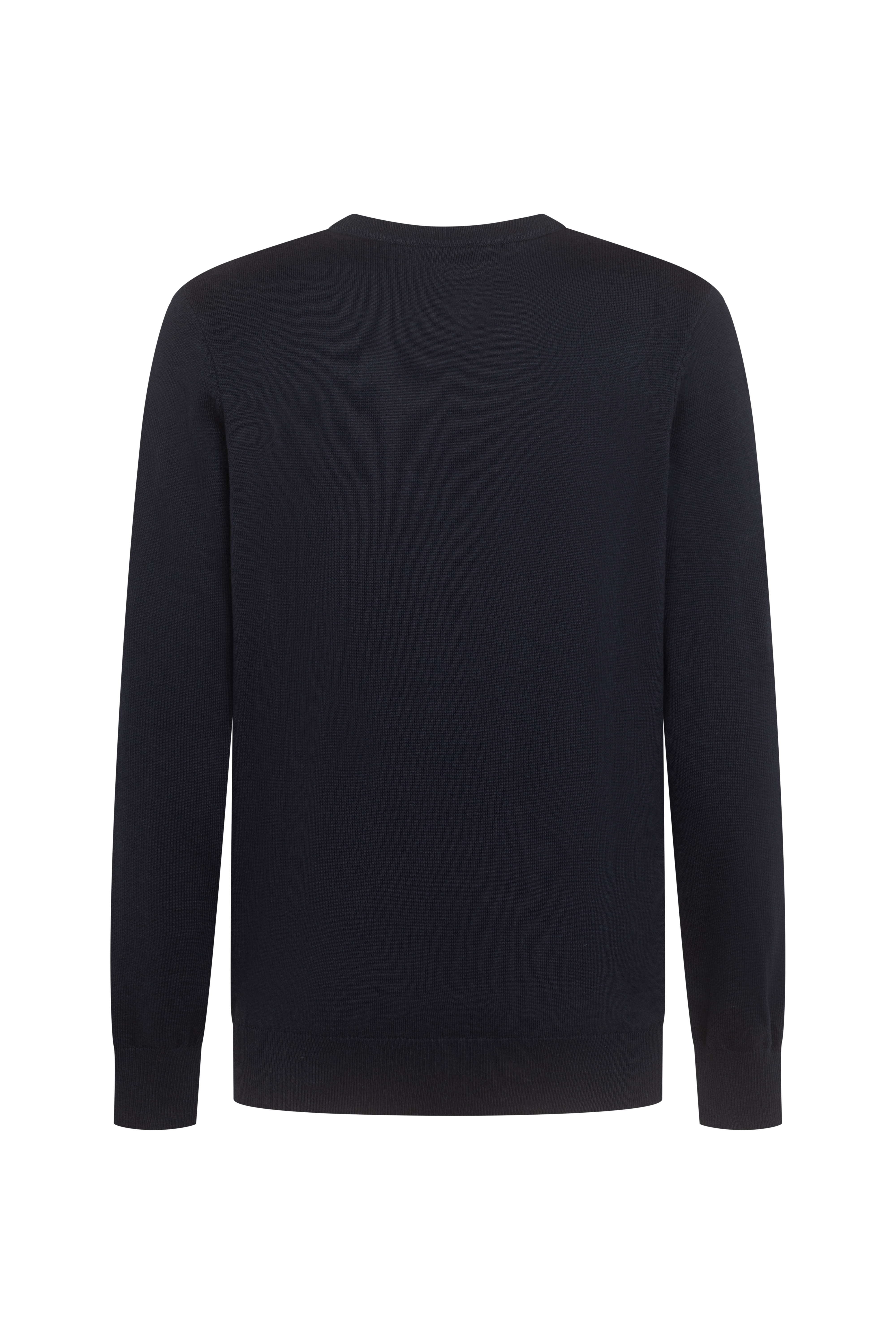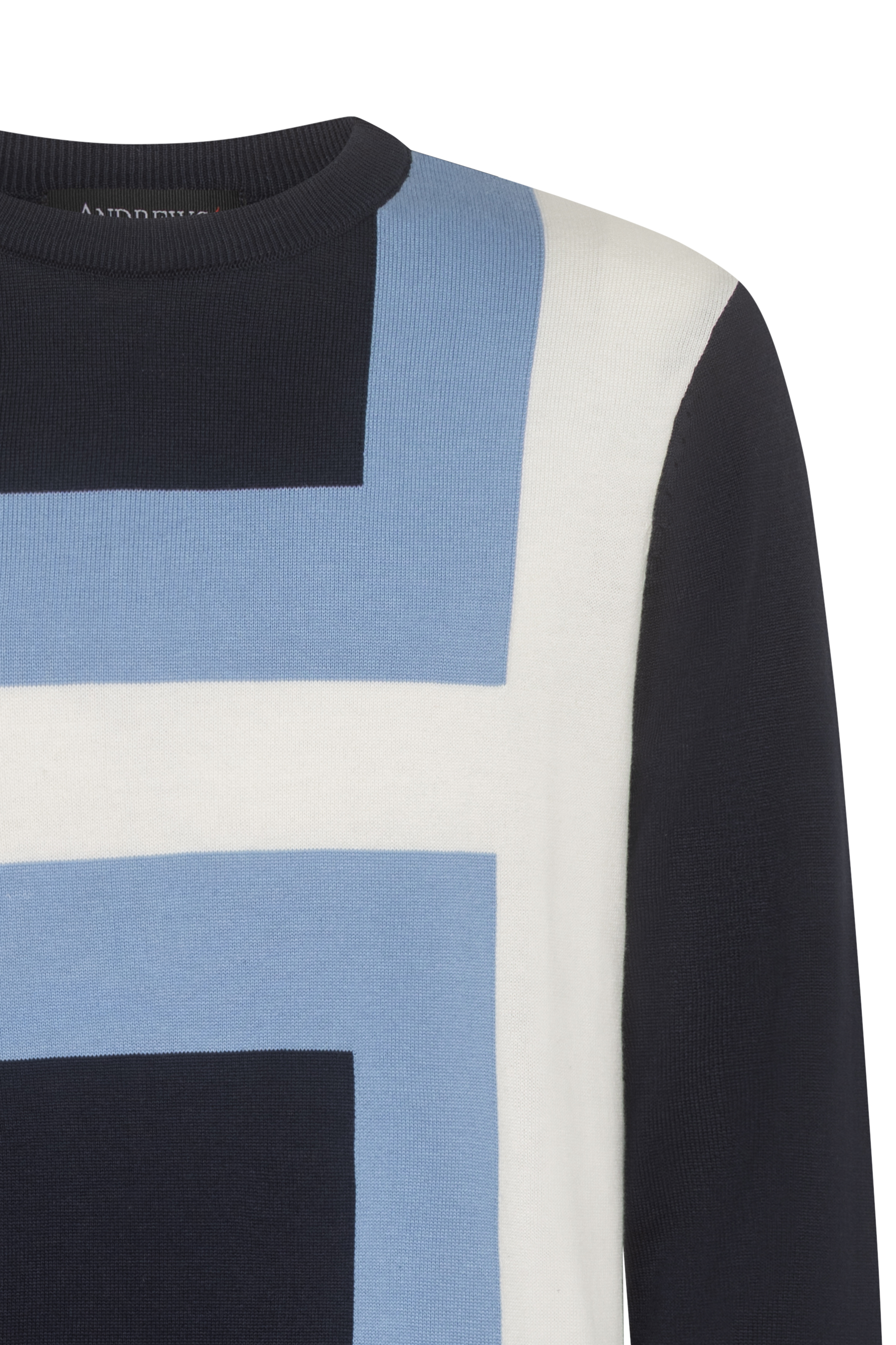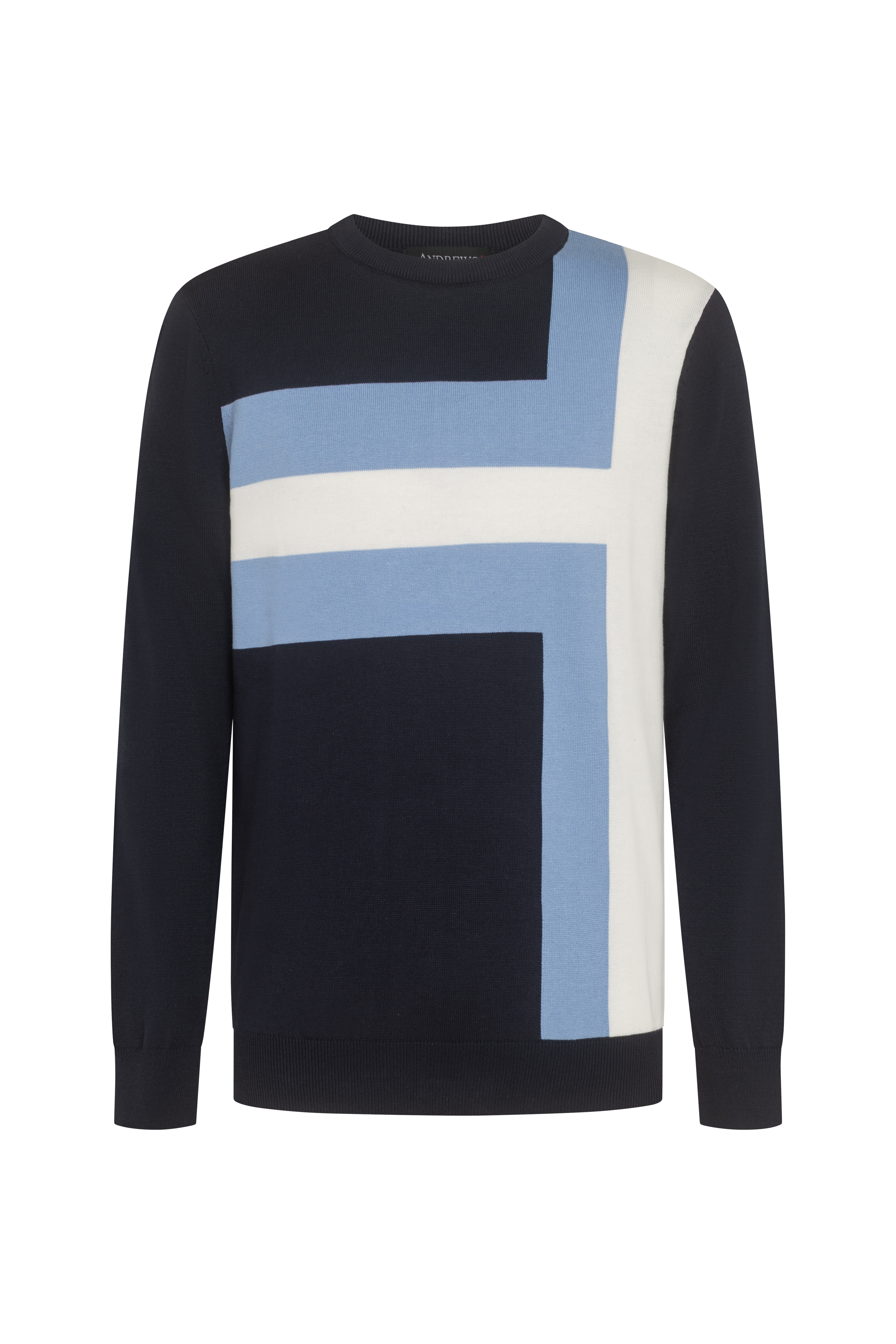 Модерен пуловер с обло деколте и геометричен десен в синьо, черно и бяло. Изработен от мека и еластична плетка, осигуряваща комфорт и свобода на движение. Подходящ за ежедневна визия с модерен и динамичен характер. Състав: 50% памук, 50% акрил.