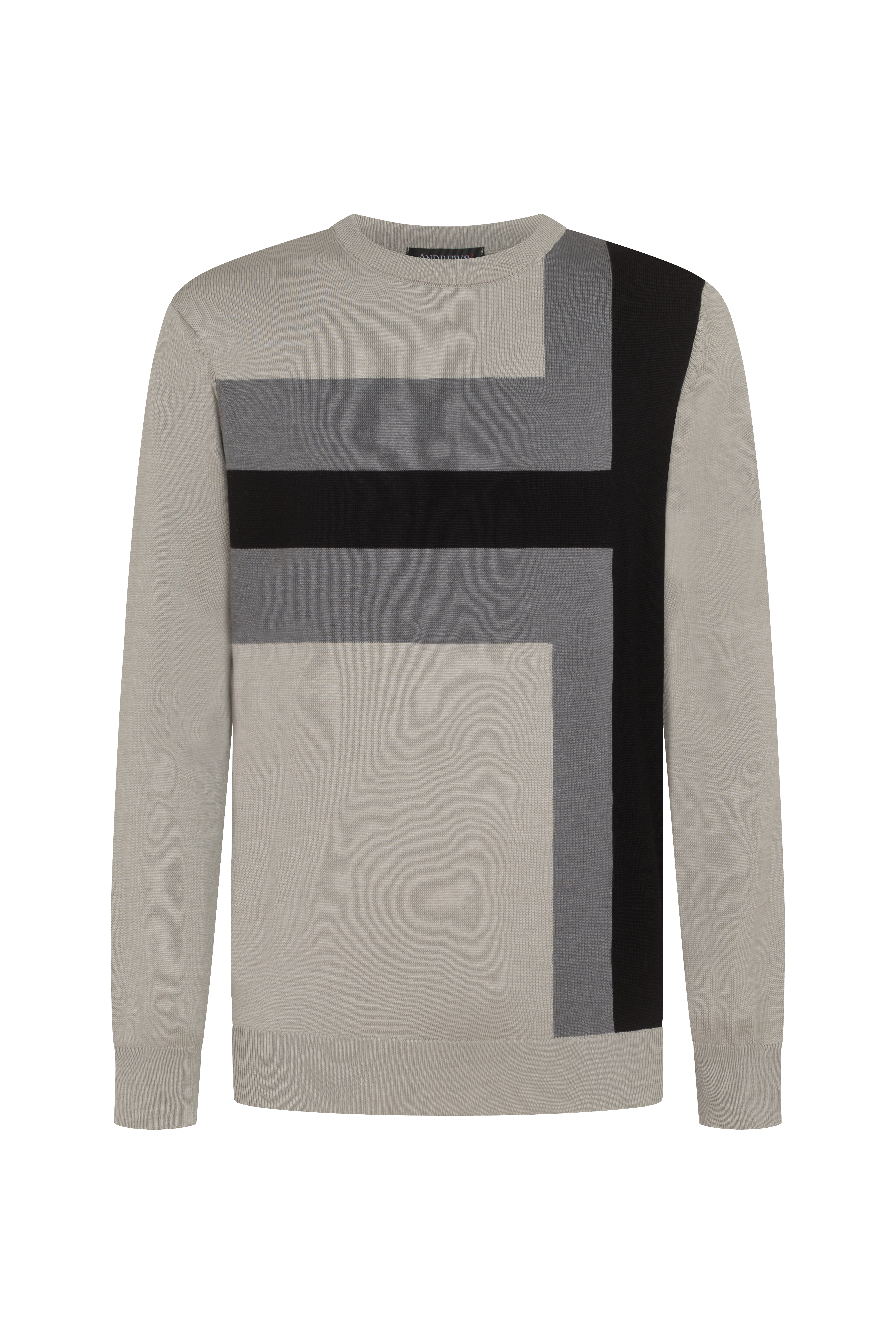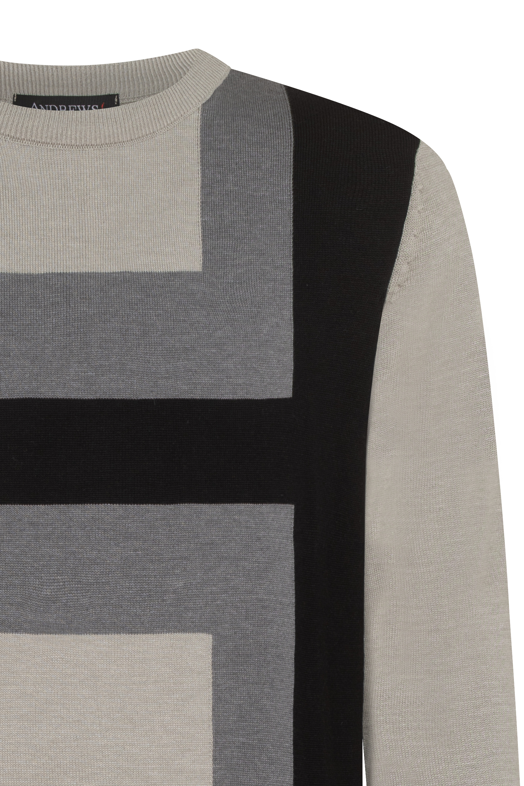 Модерен пуловер с обло деколте и геометричен дизайн в сиво, черно и графитено. Изработен от мека и еластична плетка, осигуряваща комфорт и стил. Перфектен за ежедневна визия с модерен акцент. Сезон: есен/зима. Състав: 50% памук, 50% акрил.