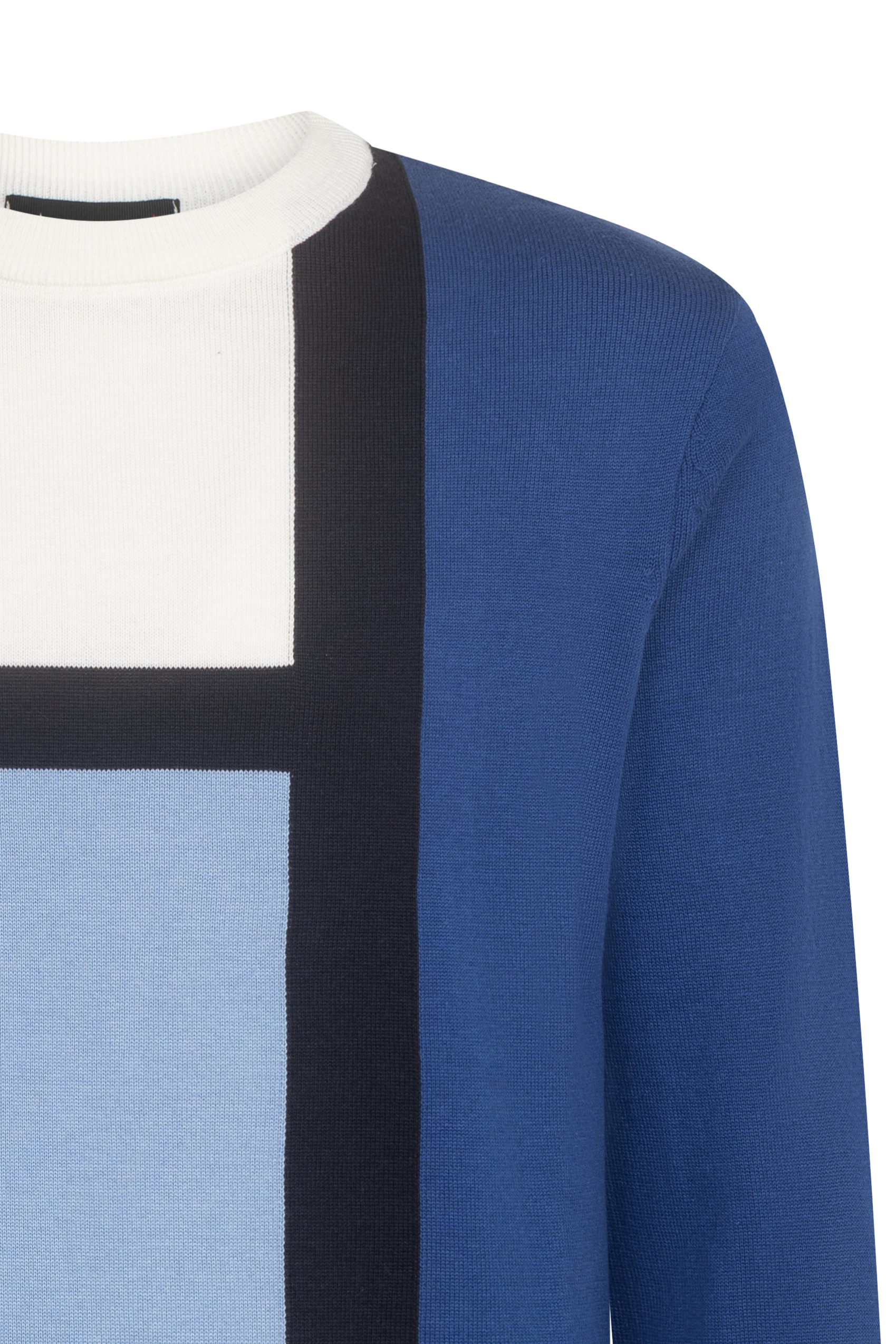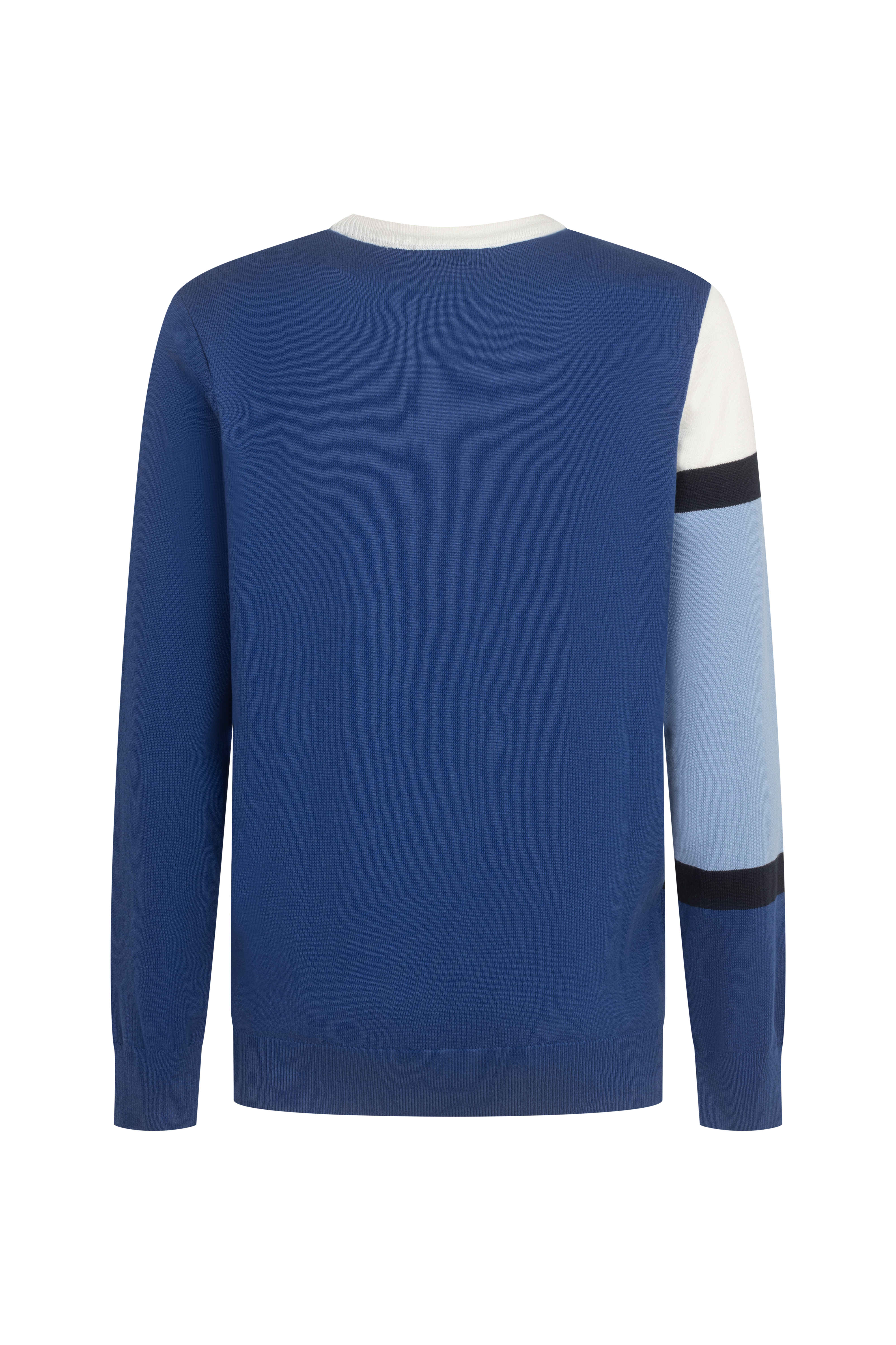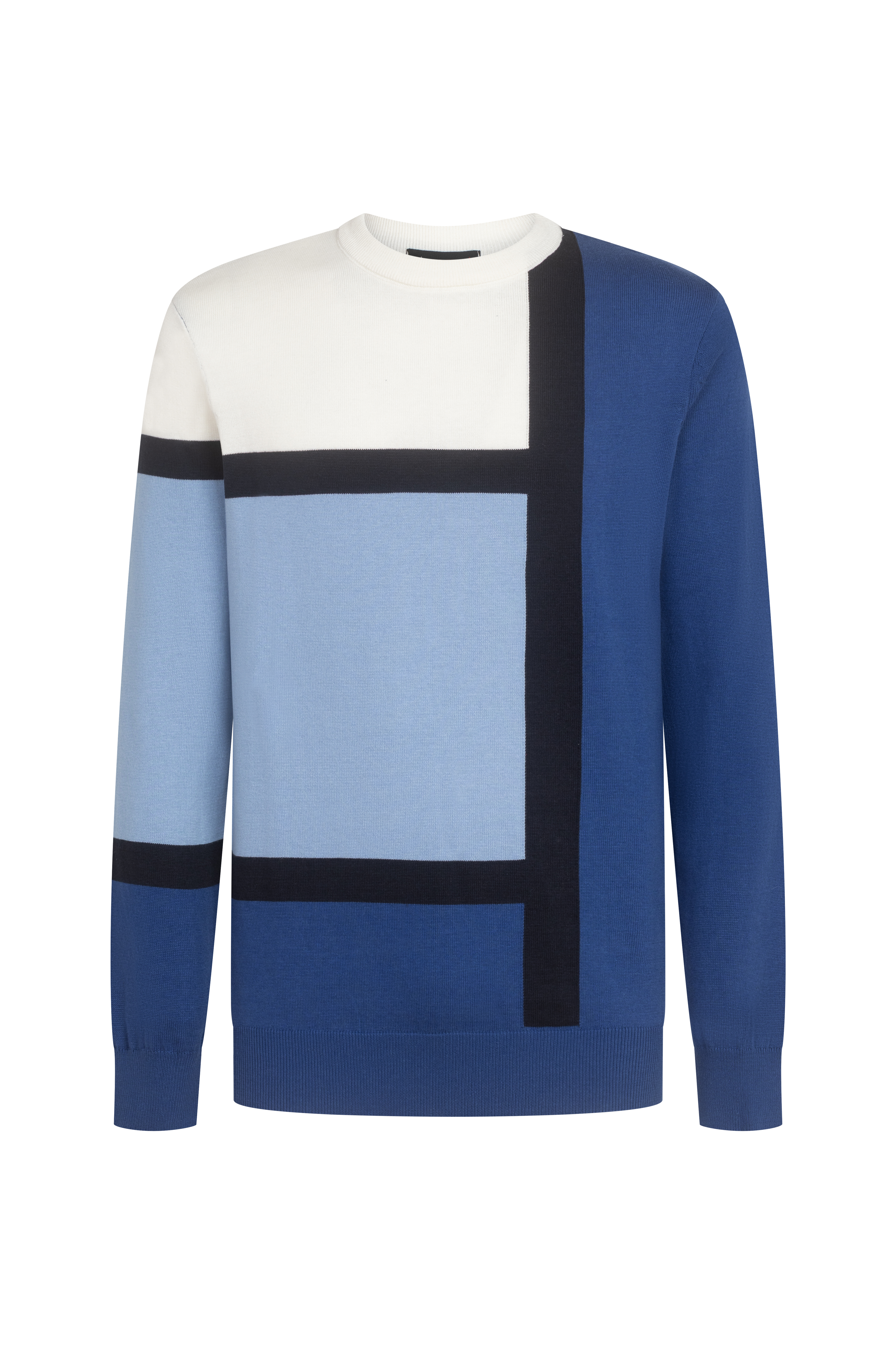 Стилен пуловер с обло деколте и геометричен дизайн в синьо, черно и бяло. Изработен от мека, еластична материя, осигуряваща комфорт и свобода на движение. Идеален за ежедневието – модерен акцент към всяка casual визия. Сезон: есен/зима. Състав: 50% памук, 50% акрил.