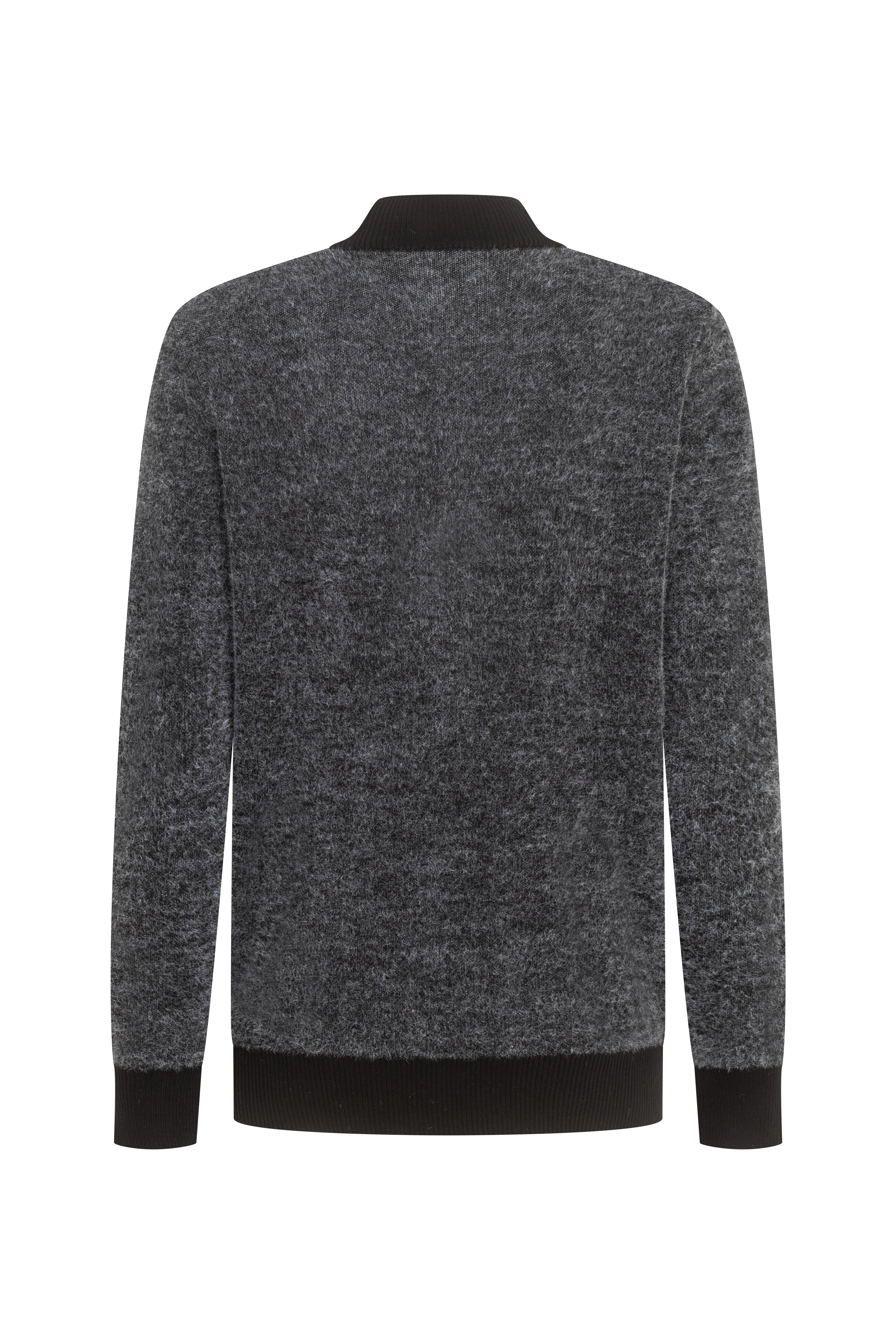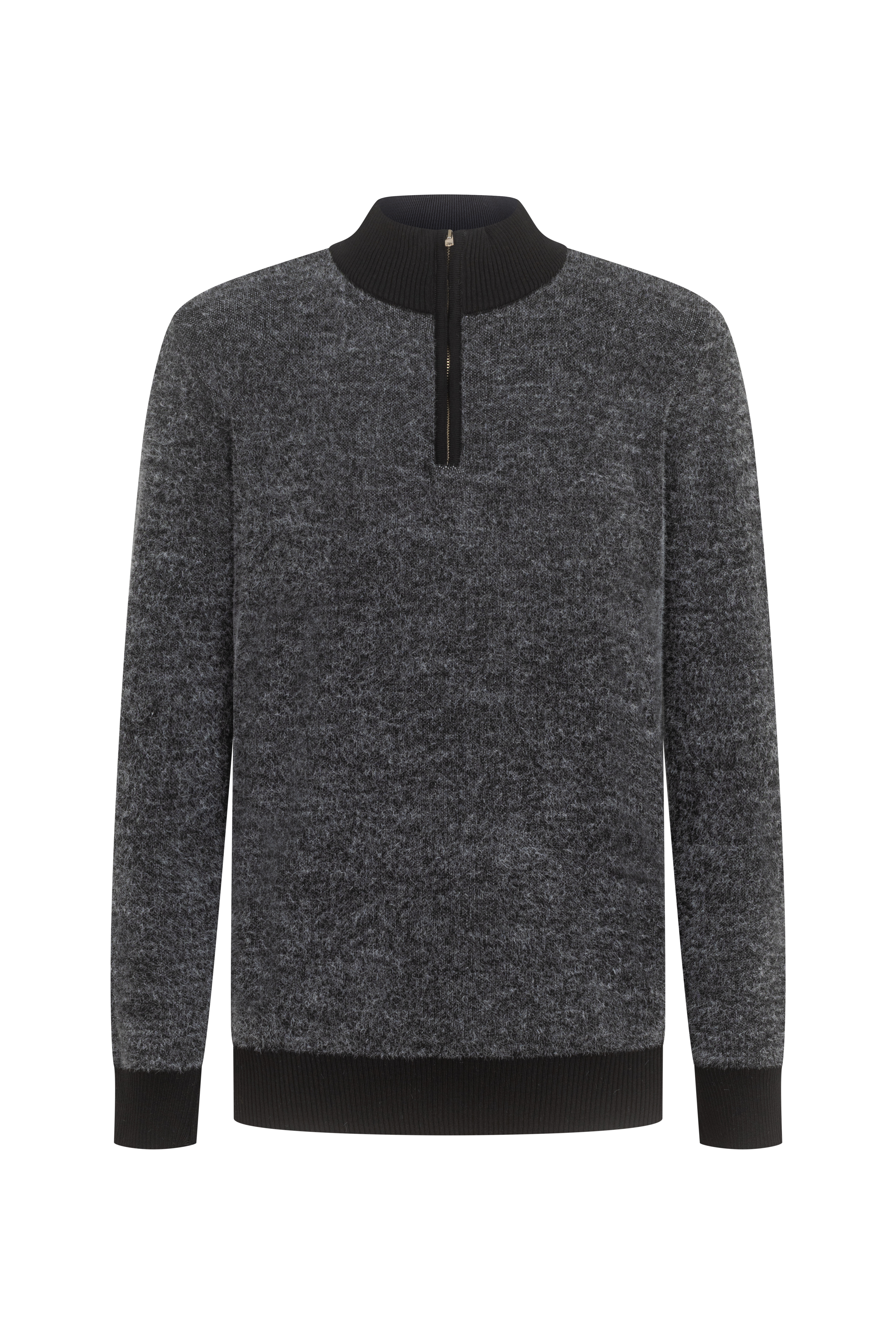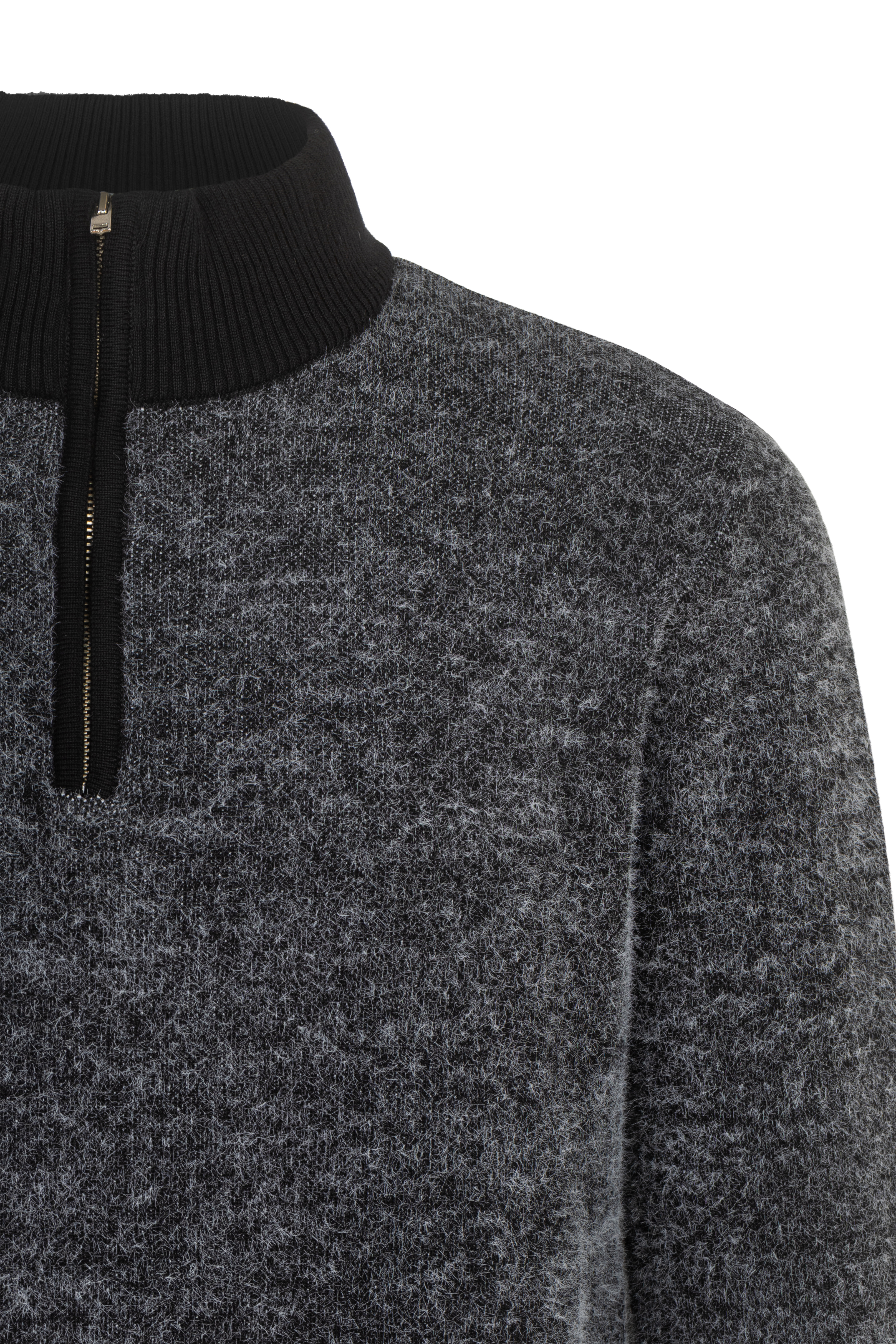 Пуловер с висока яка и къс цип, изработен от мека и топла плетка с фино меланжирана текстура. Комбинира комфорт и модерен стил – идеален за ежедневна визия с нежен спортно-елегантен акцент. Сезон: есен/зима. Състав: 30% сакал, 35% памук, 35% акрил.
