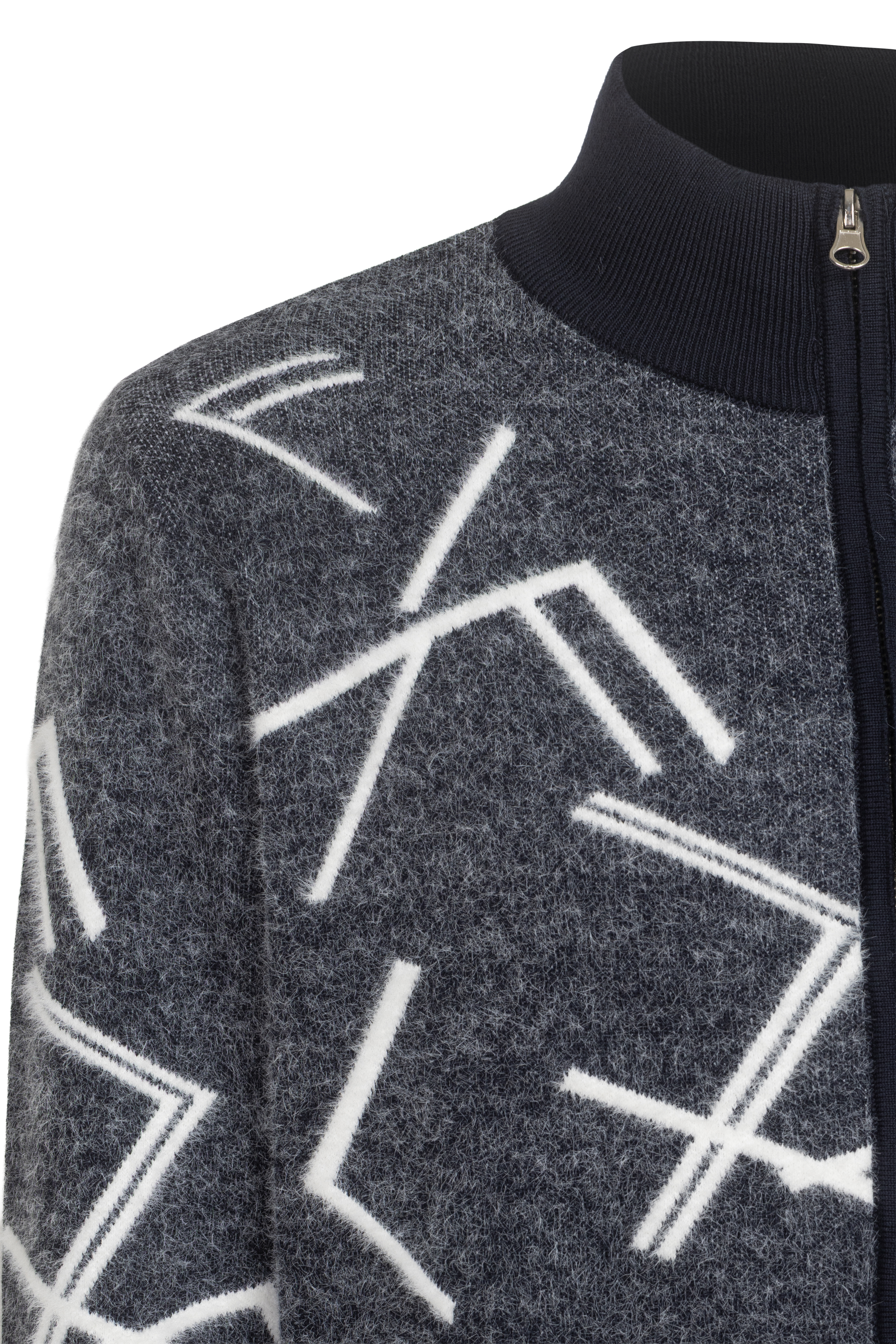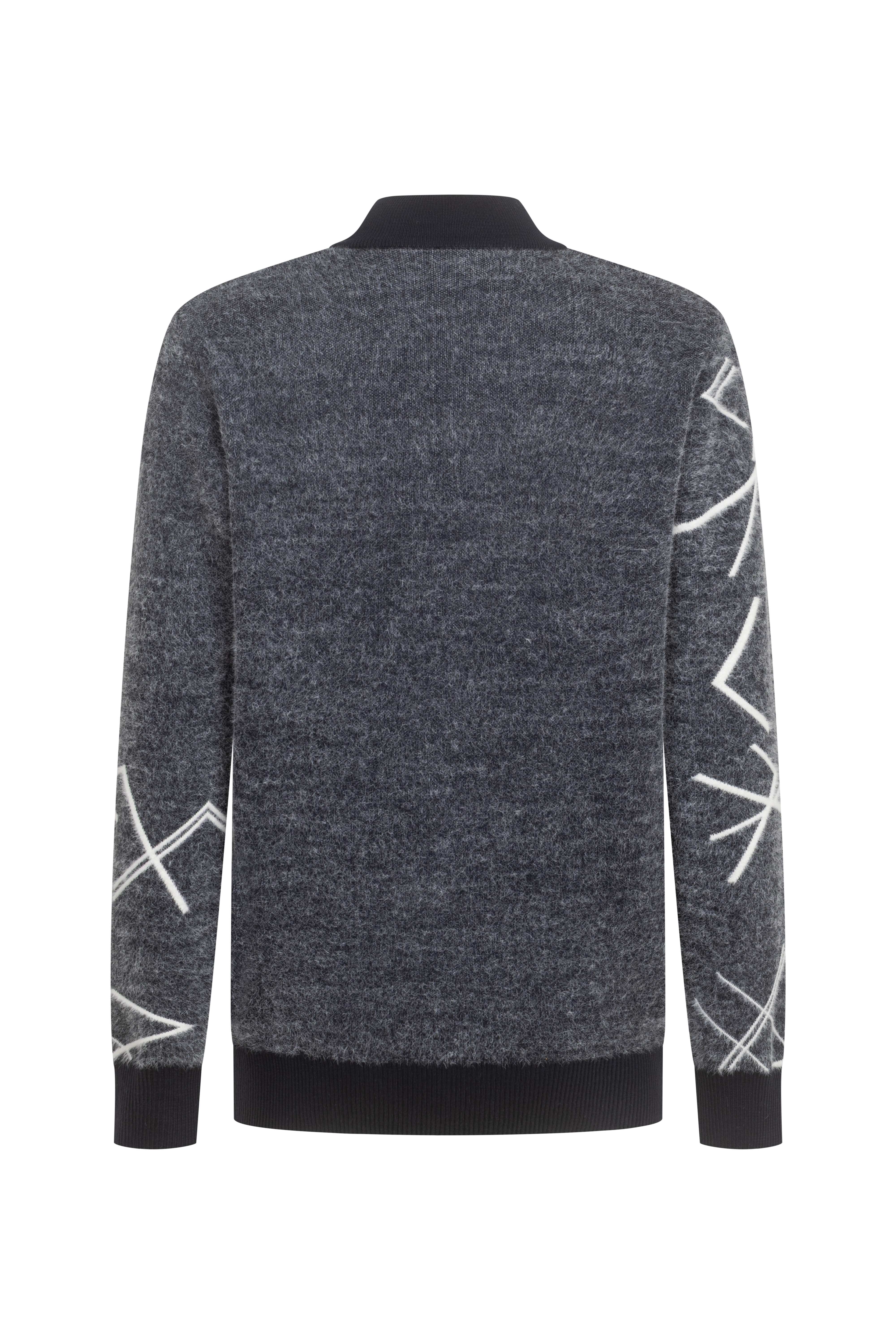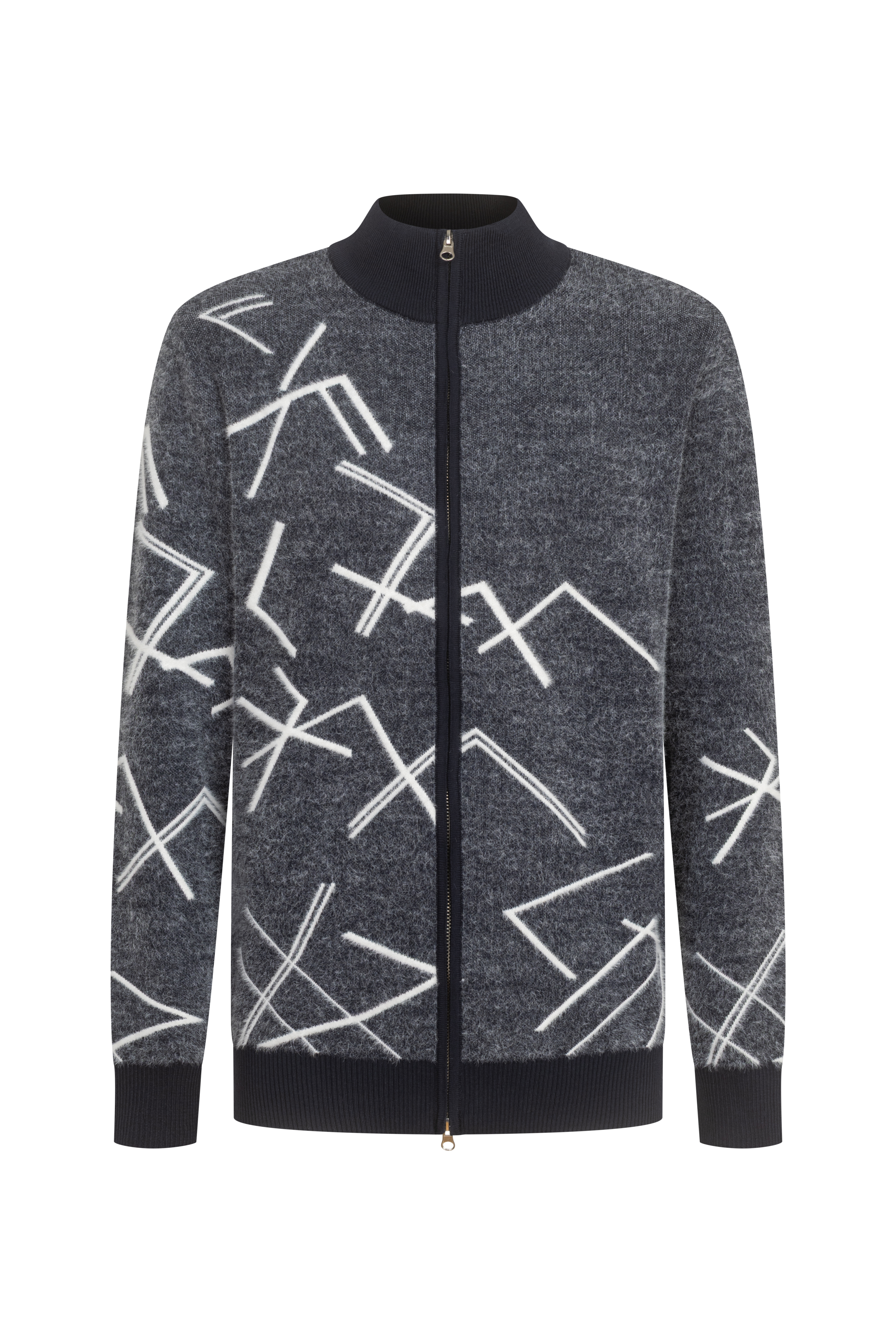 Модерна жилетка с цип и висока яка. Изработена от мека плетка с абстрактен графичен десен, която осигурява комфорт и топлина. Идеален избор за ежедневна визия с артистичен и съвременен характер. Сезон: есен/зима. Състав: 33% сакал, 35% памук, 35% акрил.
