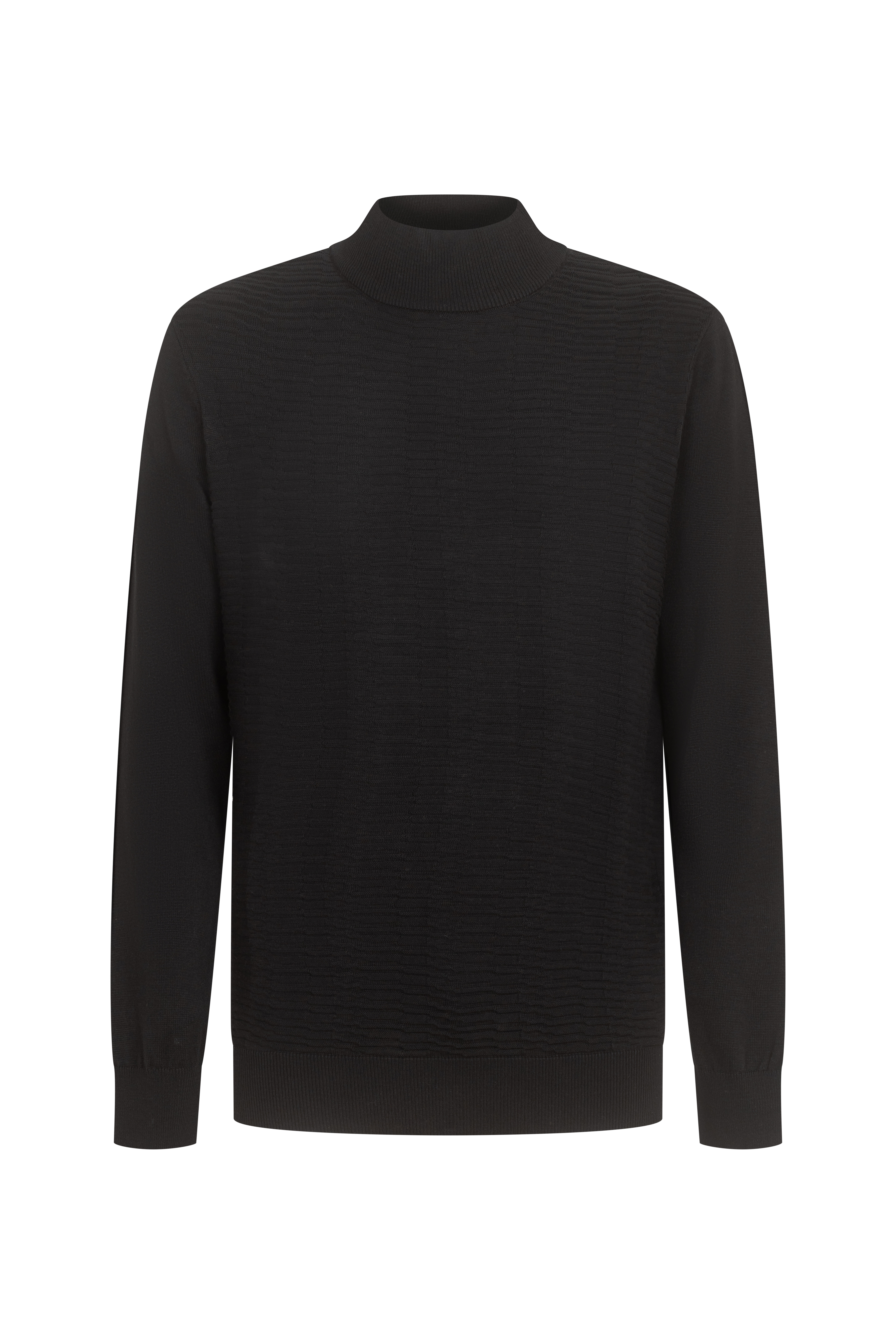 Стилен пуловер с висока яка и фина хоризонтална плетка. Меката материя осигурява комфорт и изискан вид – перфектен избор за smart-casual визия в офиса или ежедневието. Сезон: есен/зима. Състав: 50% памук, 50% акрил.