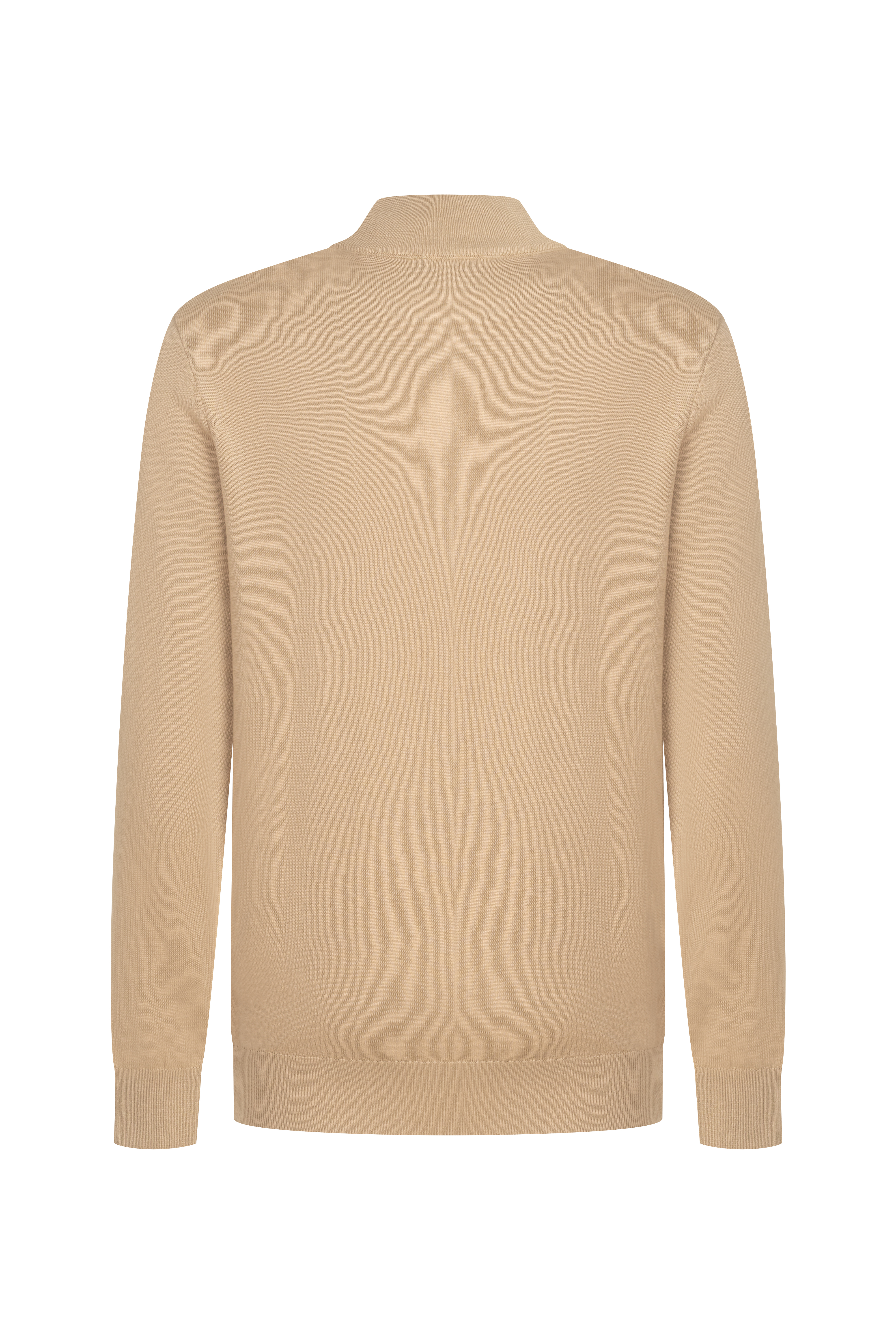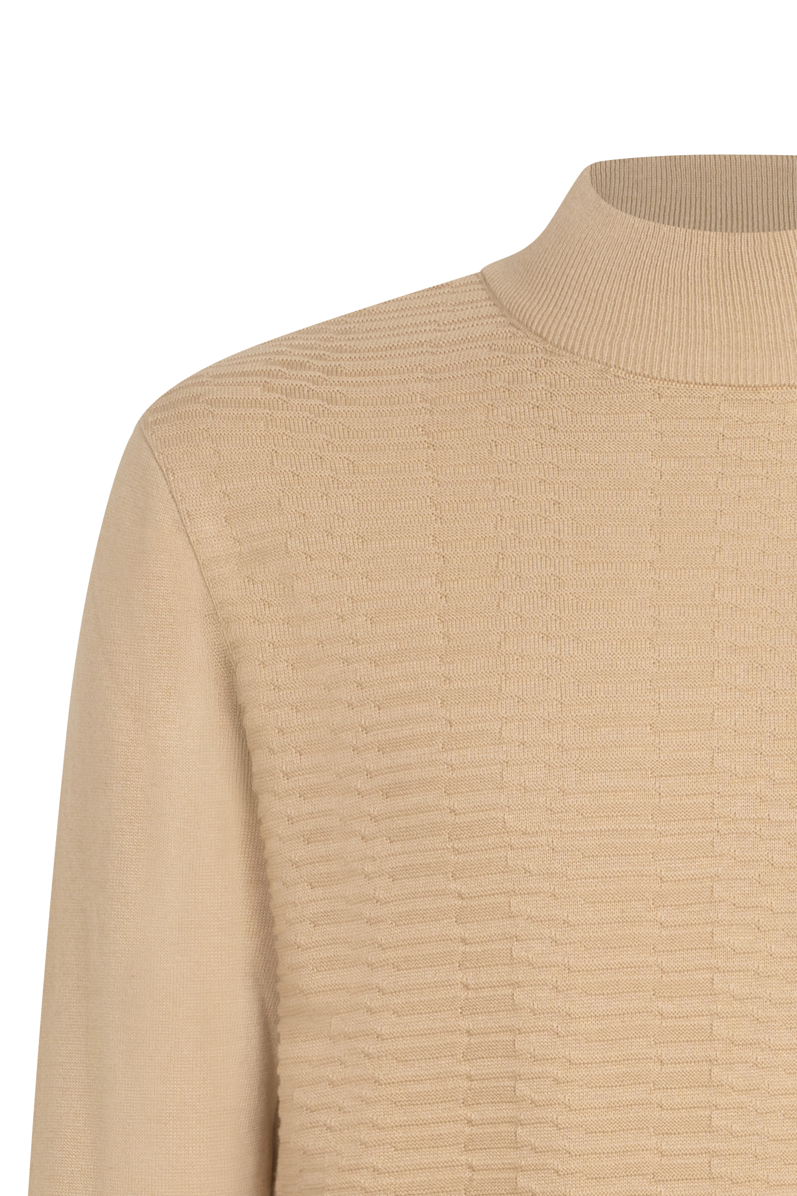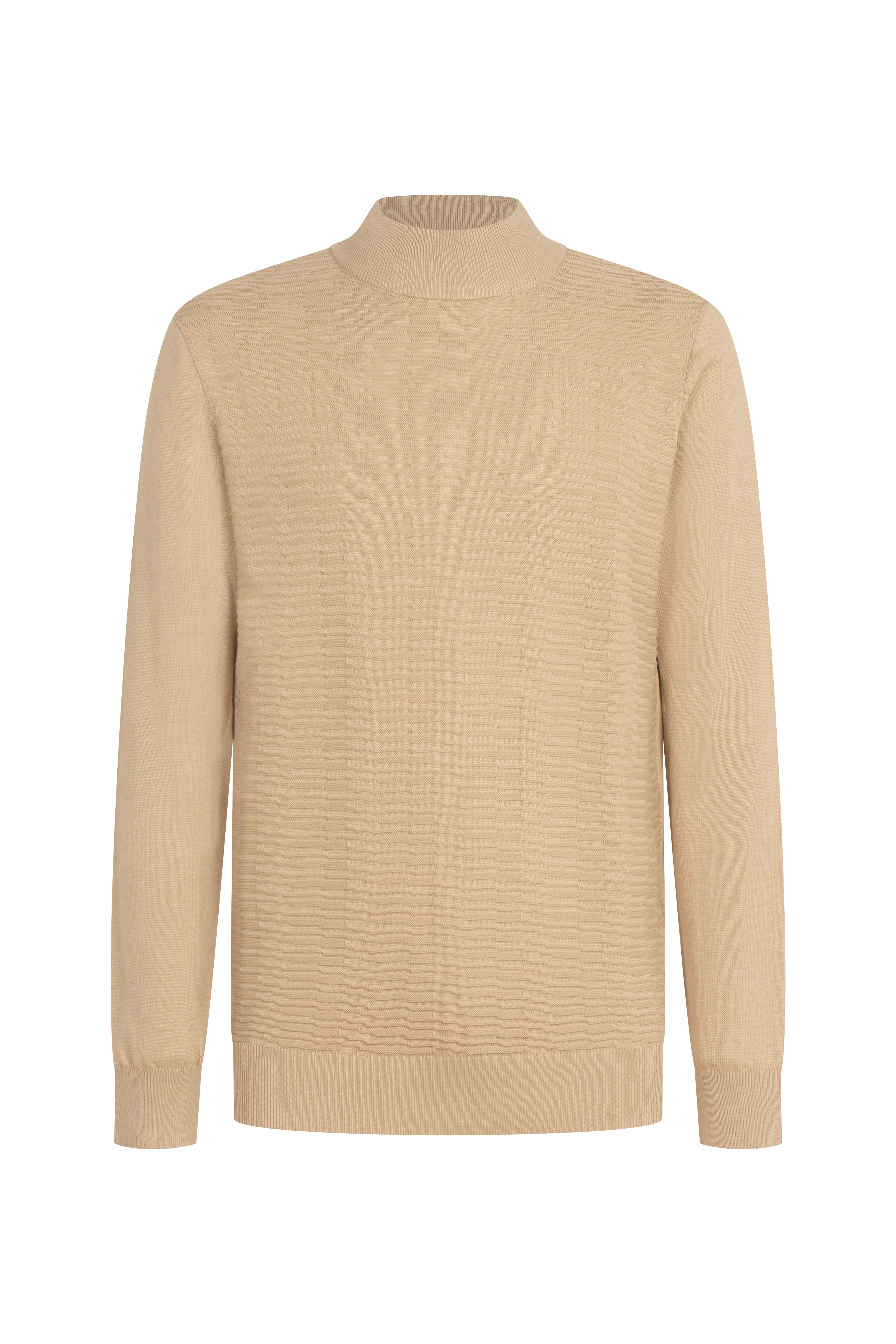 Стилен пуловер с висока яка и фина хоризонтална плетка. Меката материя осигурява комфорт и изискан вид – перфектен избор за smart-casual визия в офиса или ежедневието. Сезон: есен/зима. Състав: 50% памук, 50% акрил.