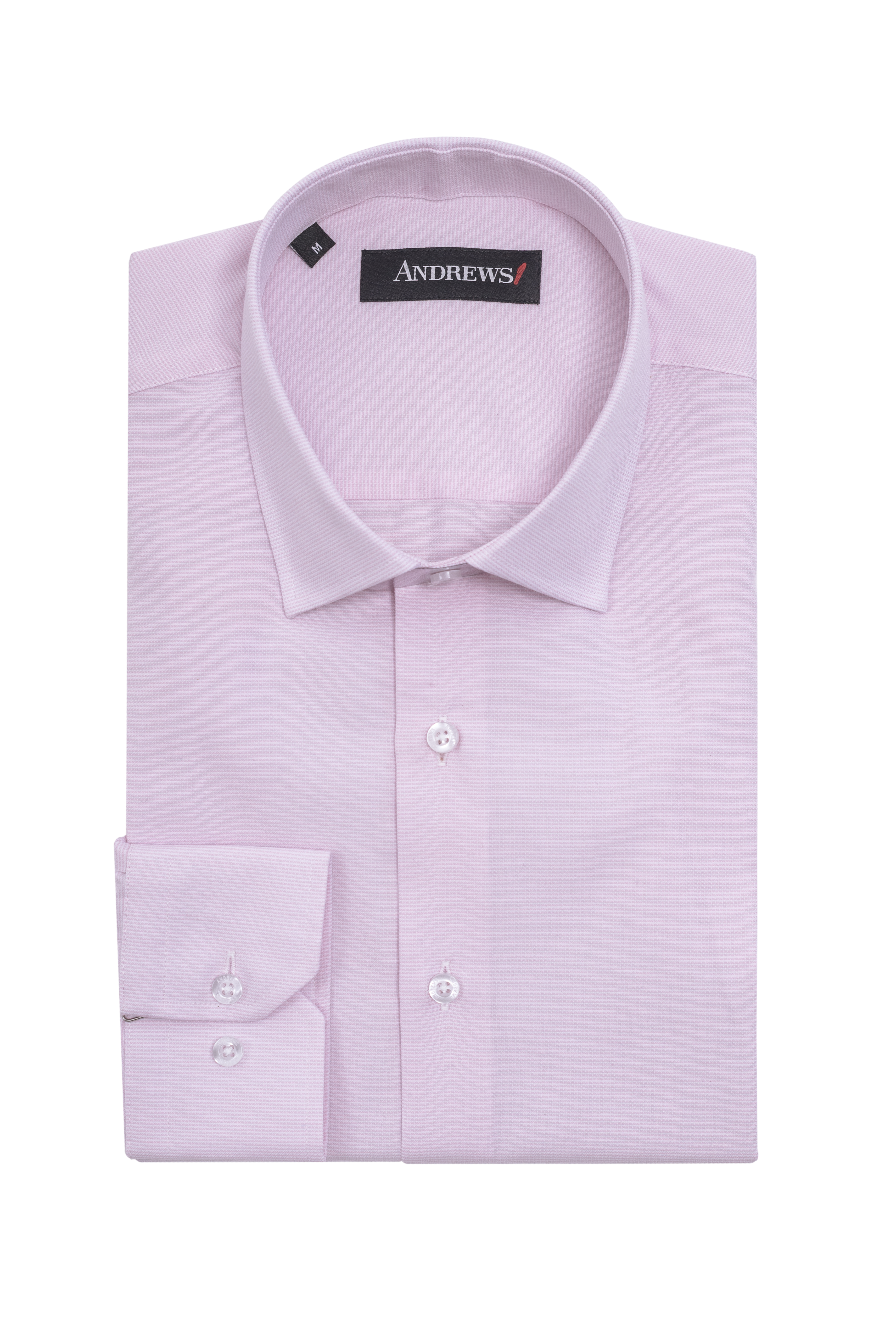 Бизнес риза от много фино структуриран плат. Розов цвят. Вталена кройка с по-широки рамене. Подходяща за сезон пролет / лято. Състав : 55 % памук, 45 % полиестер