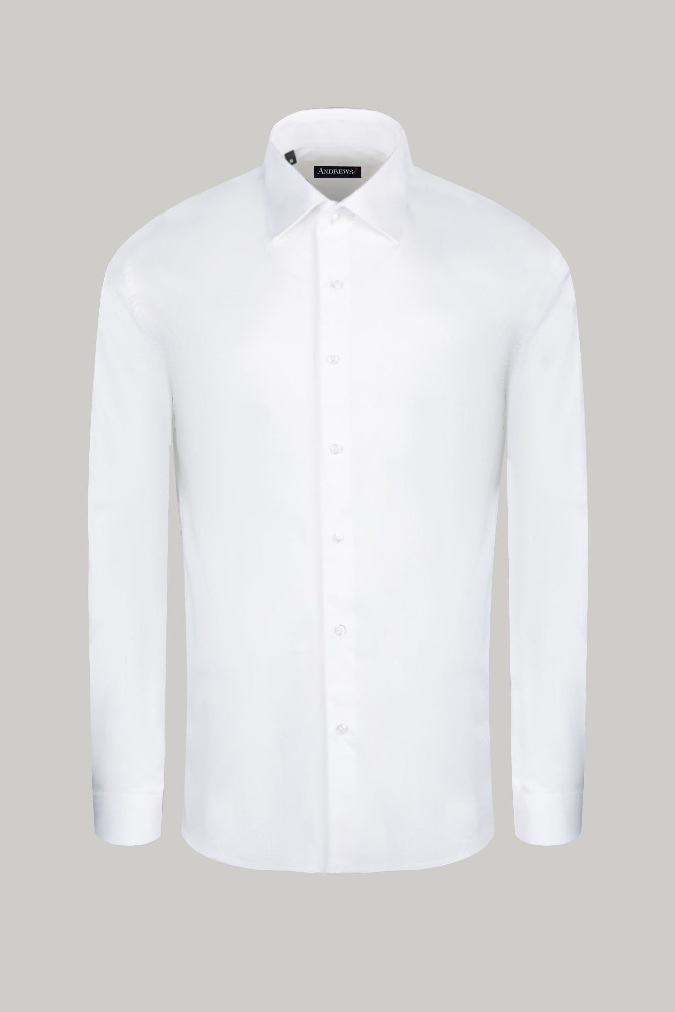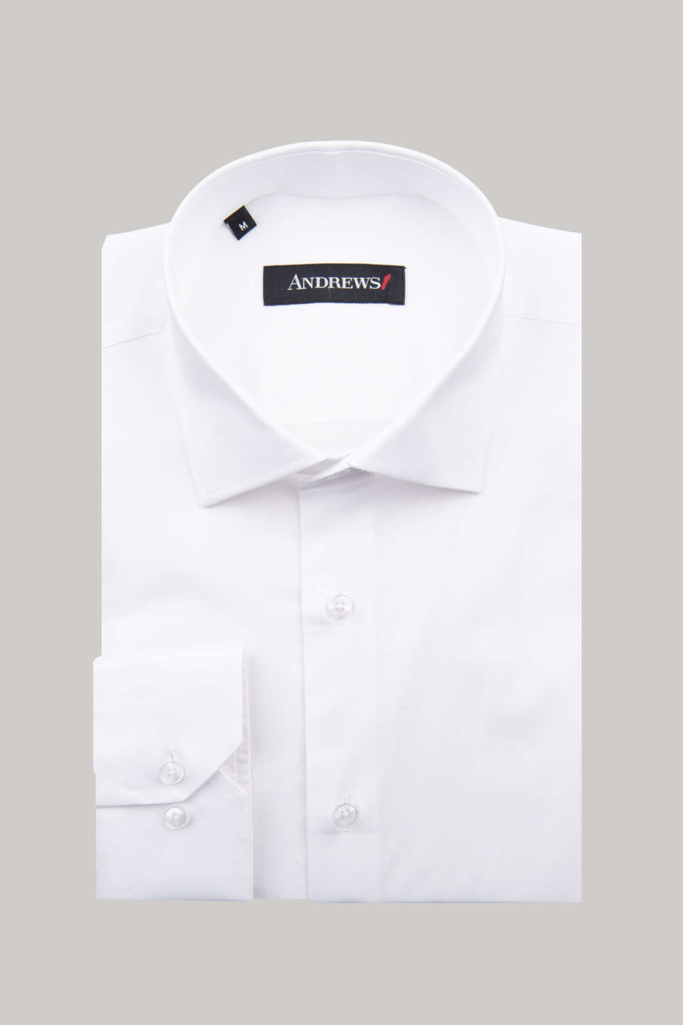 Бяла памучна риза с еластан. Бизнес стил. Дюс. Вталена кройка с по-широки рамене. Подходяща за сезон пролет / лято. Състав : 97 % памук, 3 % еластан
