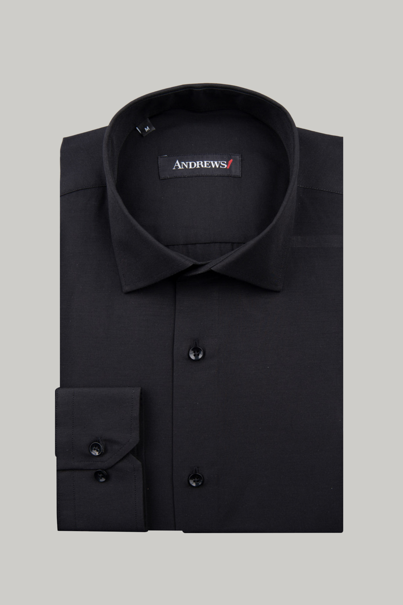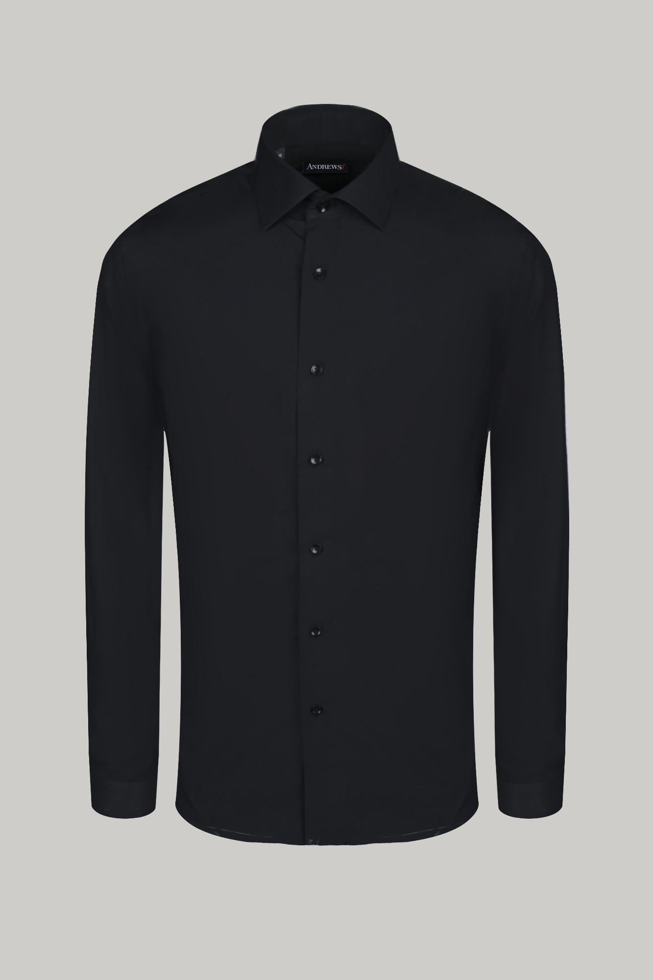 Черна памучна риза с еластан. Бизнес стил. Дюс. Вталена кройка с по-широки рамене. Подходяща за сезон пролет / лято. Състав : 97 % памук, 3 % еластан