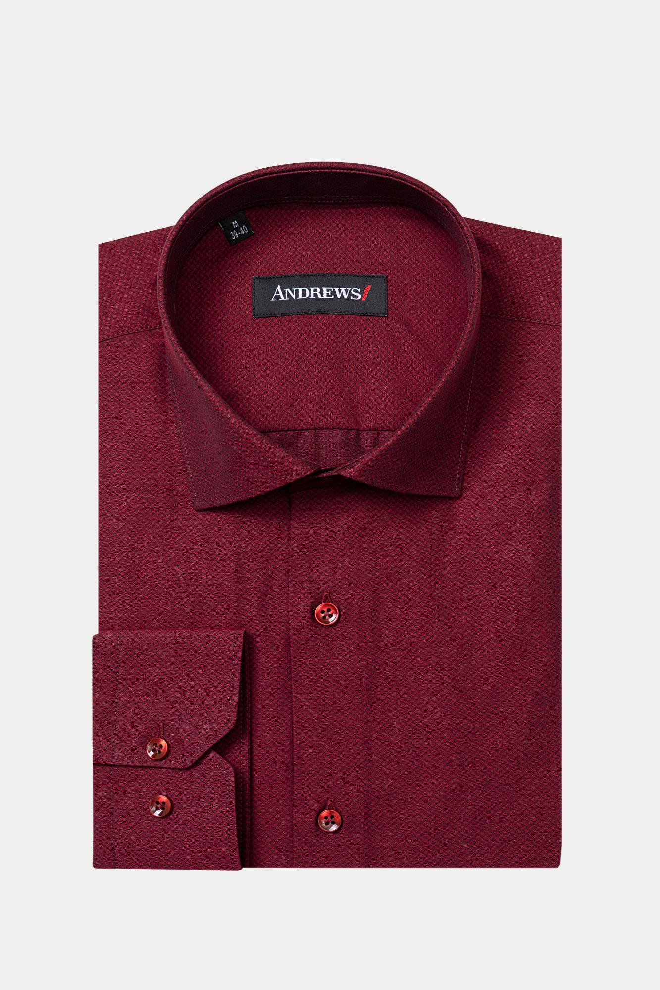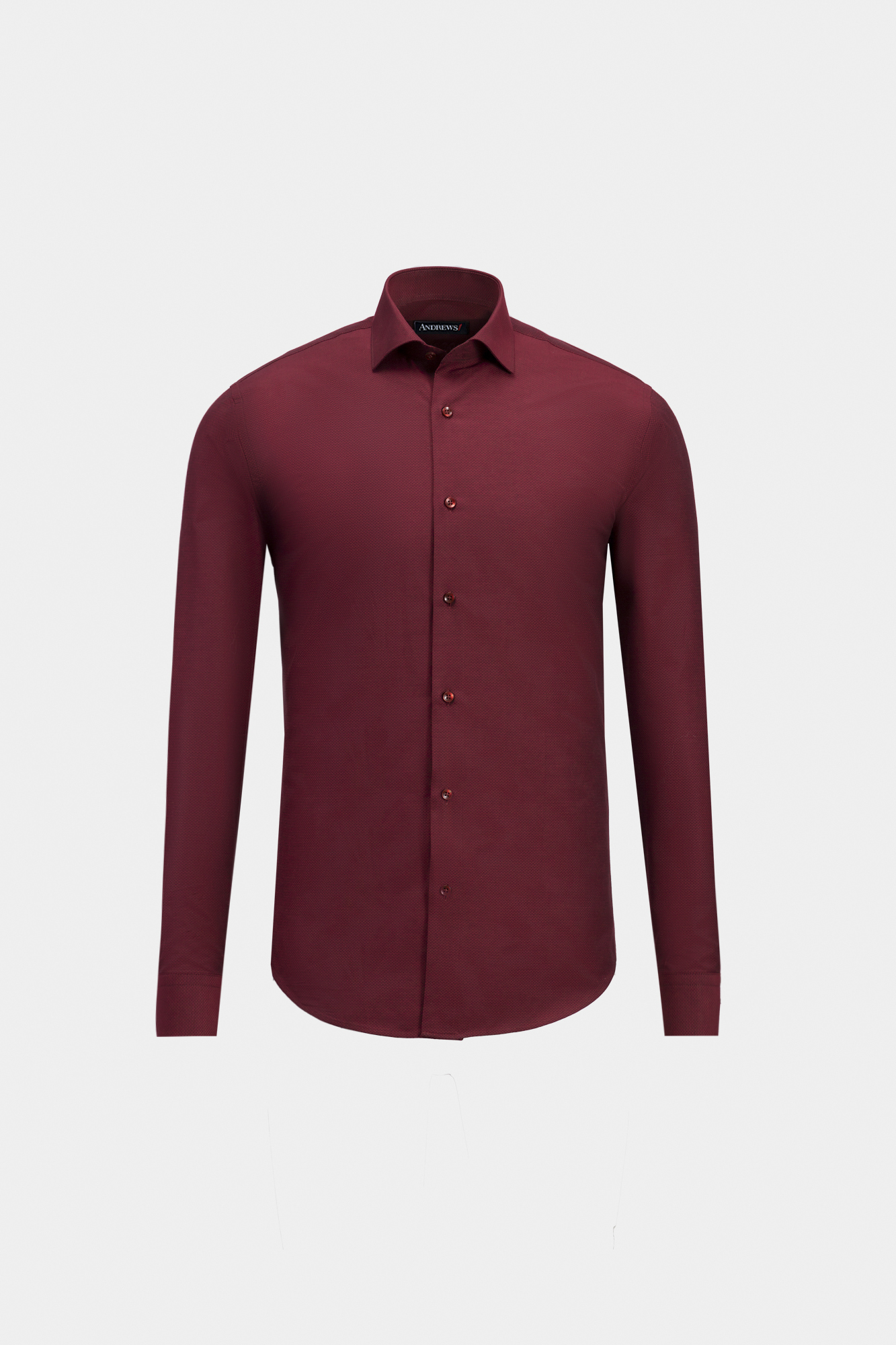 Мъжка бизнес риза в цвят бордо. Фина структура на плата. Вталена кройка с по-широки рамене. Подходяща за сезон пролет / лято. Състав : 55 % памук, 45 % полиестер
