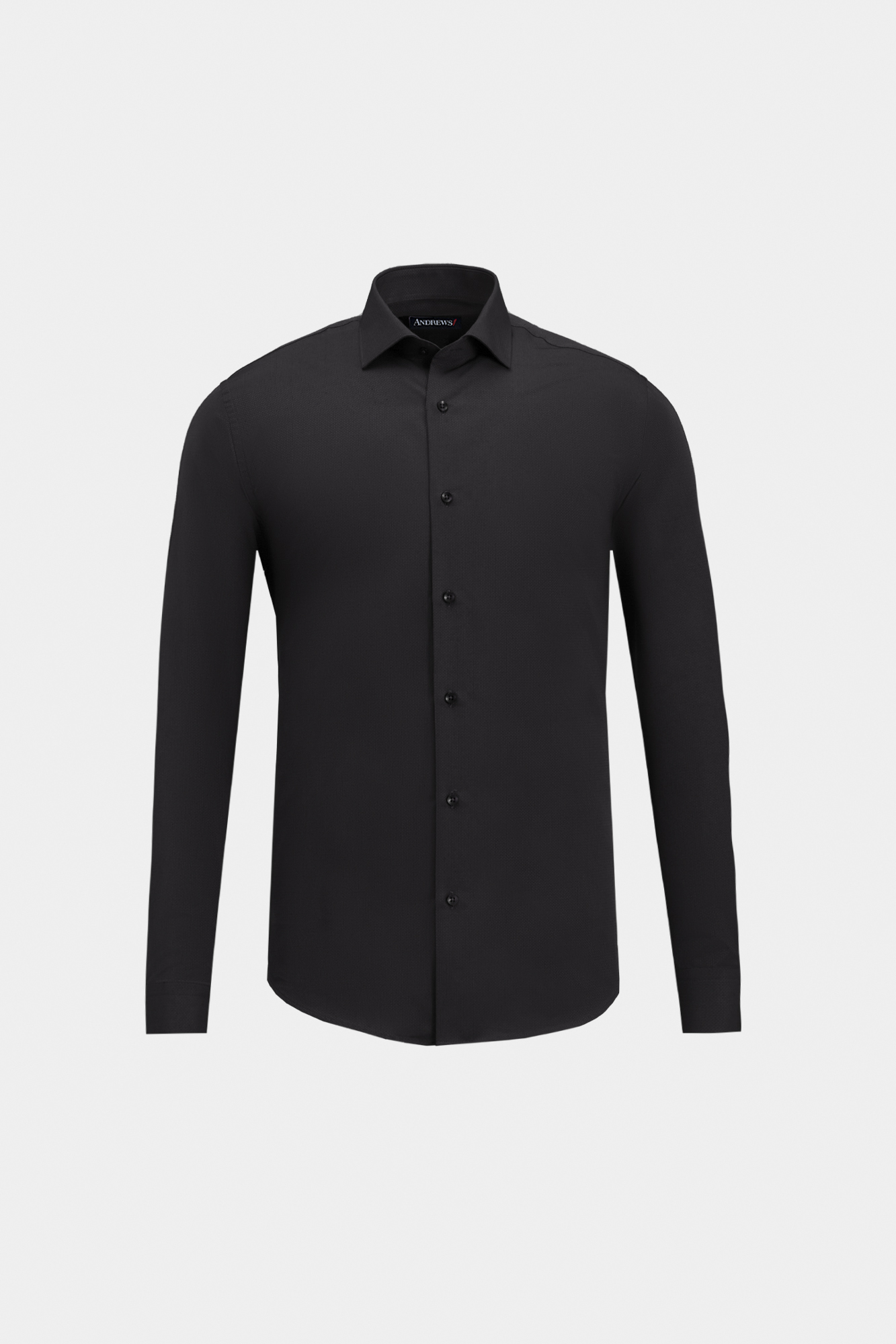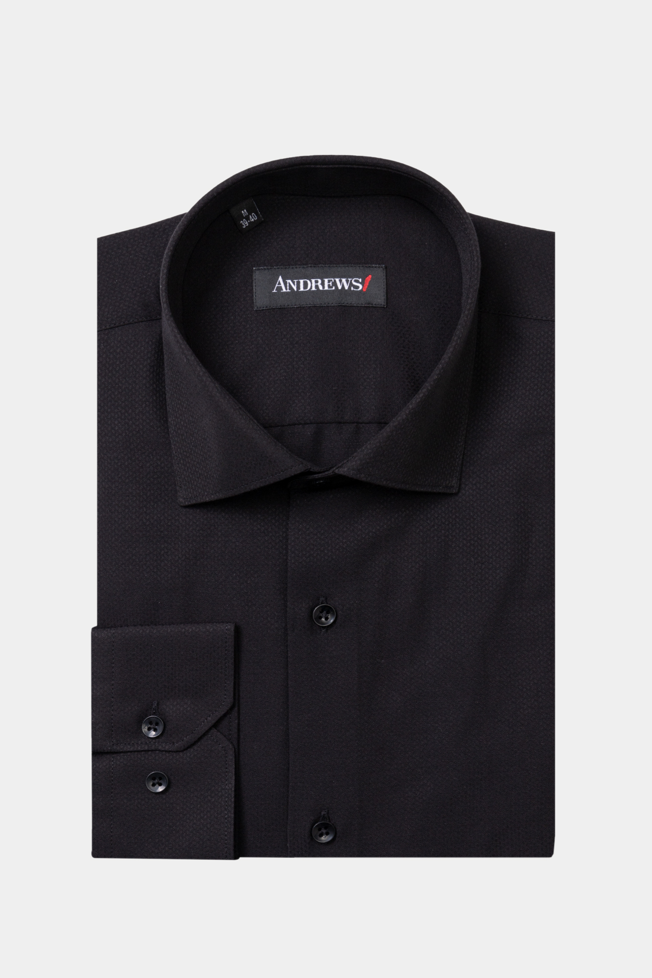 Черна бизнес риза. Фина структура на плата. Вталена кройка с по-широки рамене. Подходяща за сезон пролет / лято. Състав : 55 % памук, 45 % полиестер