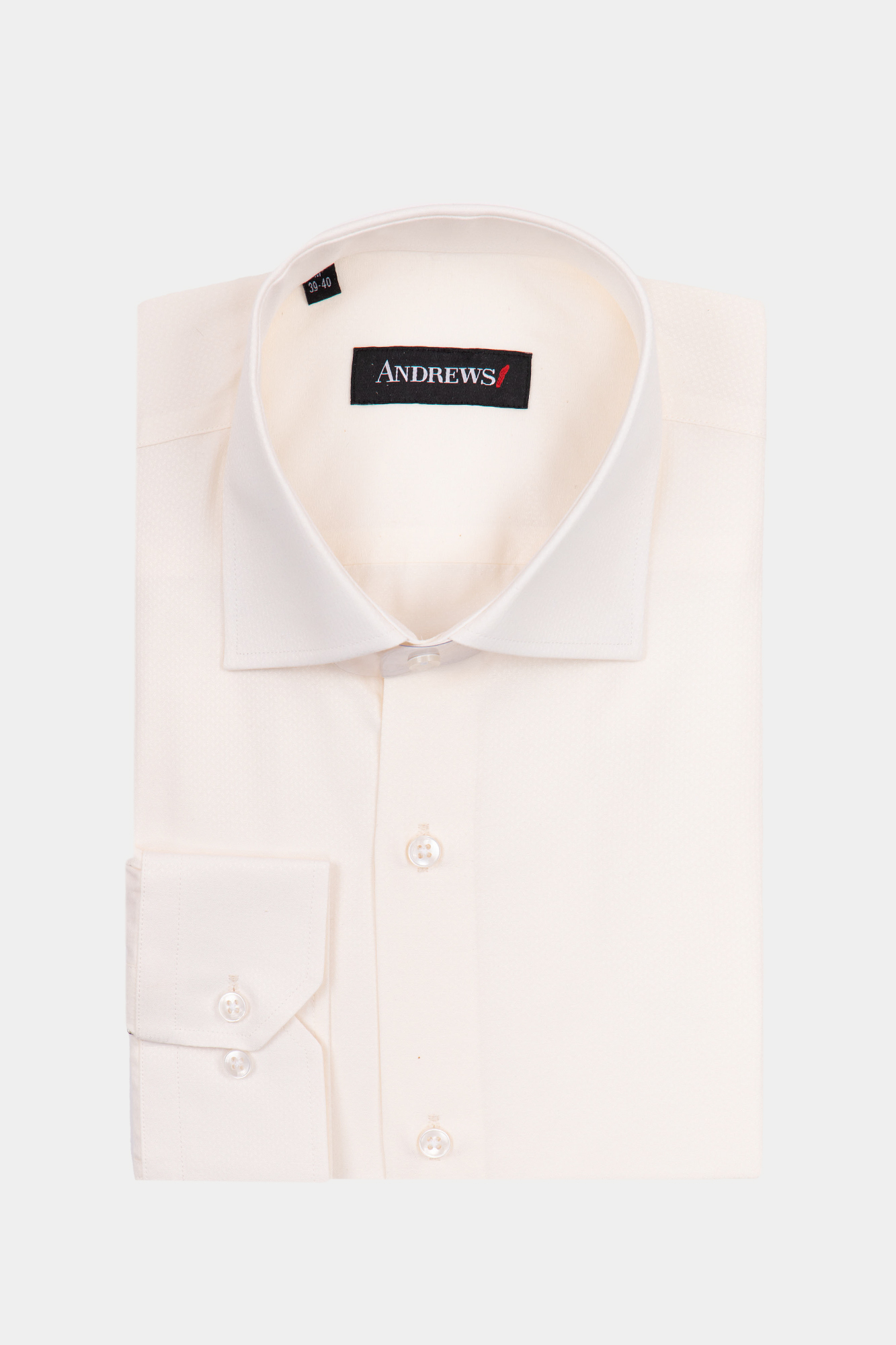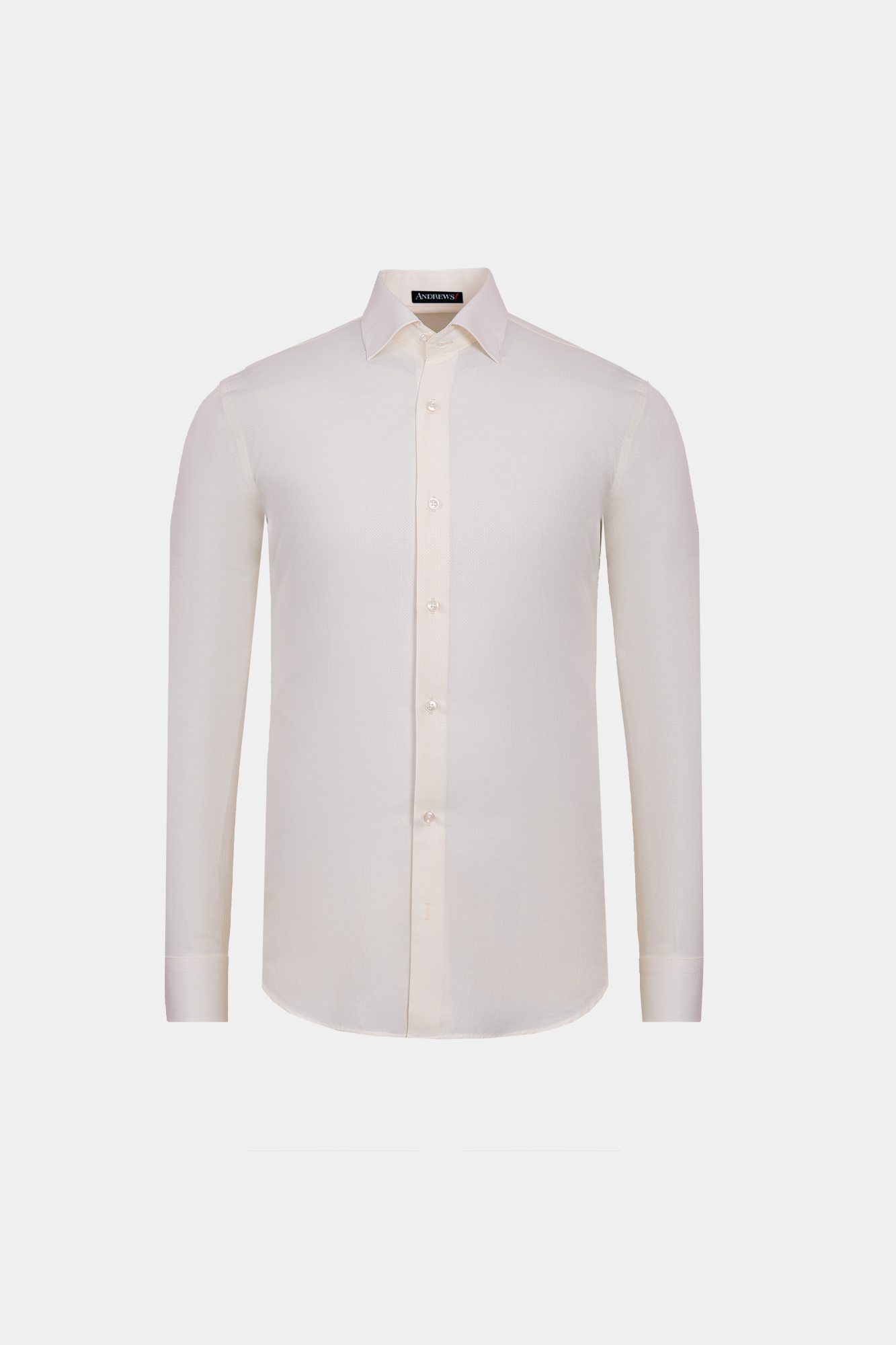 Бизнес риза в цвят екрю. Фина структура на плата. Вталена кройка с по-широки рамене. Подходяща за целогодишно носене. Състав : 55 % памук, 45 % полиестер
