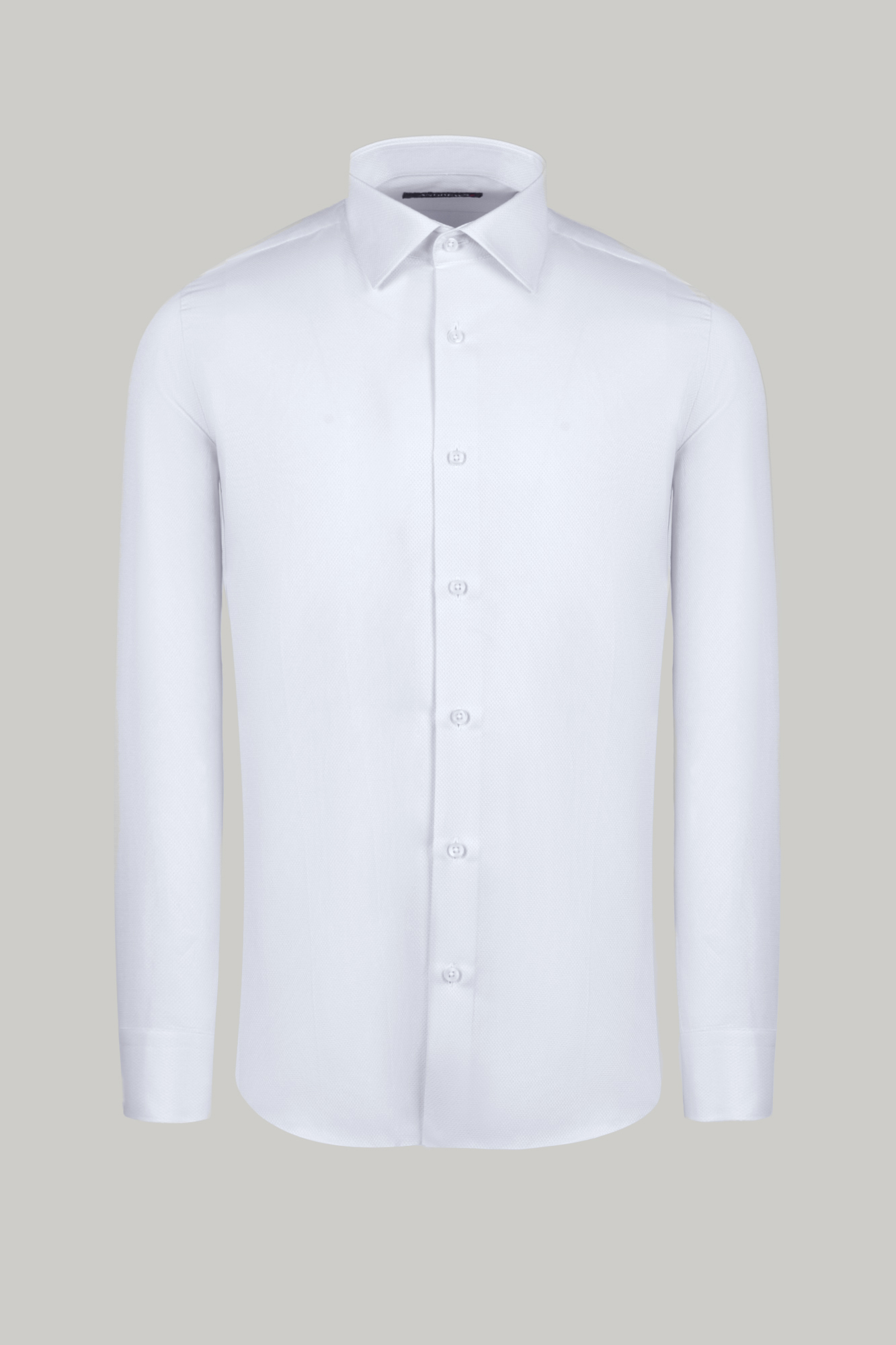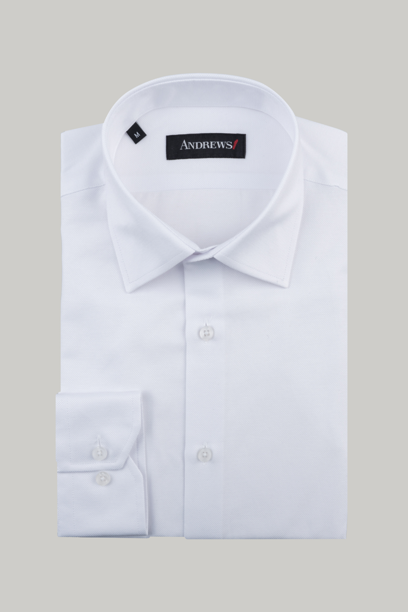 Бяла риза от структуриран плат. Бизнес стил. Права кройка. Подходяща за сезон пролет / лято. Състав : 55 % памук, 45 % полиестер
