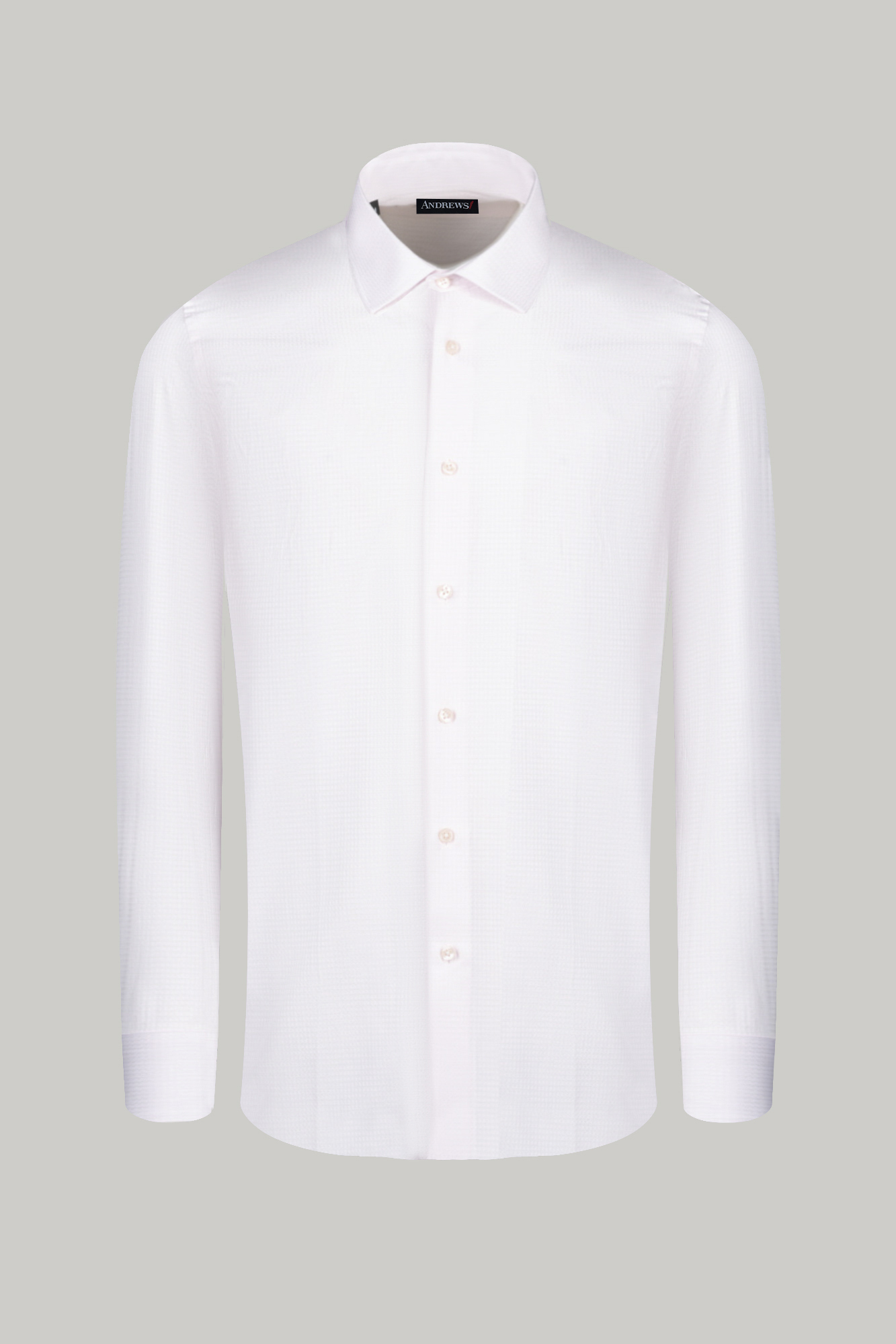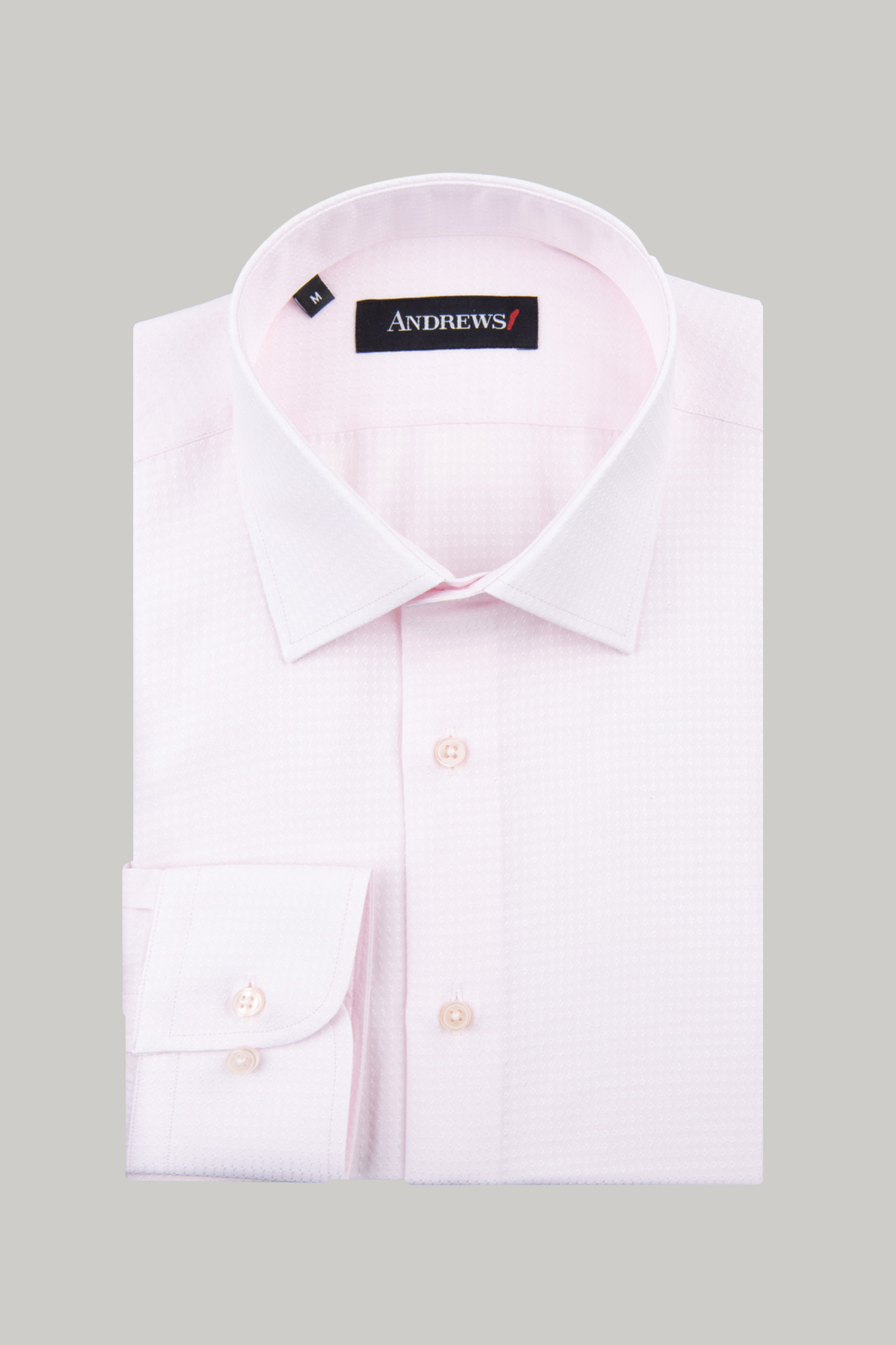Бледорозова бизнес риза от структуриран плат. Права кройка. Подходяща за сезон пролет / лято. Състав : 55 % памук, 45 % полиестер