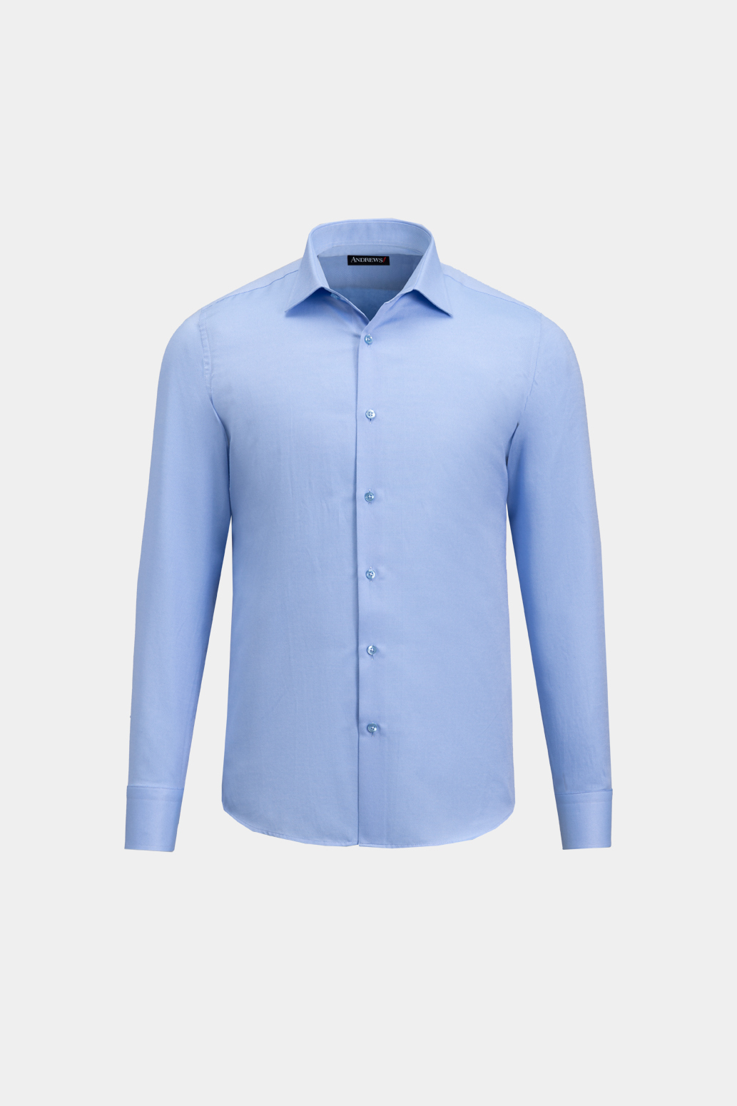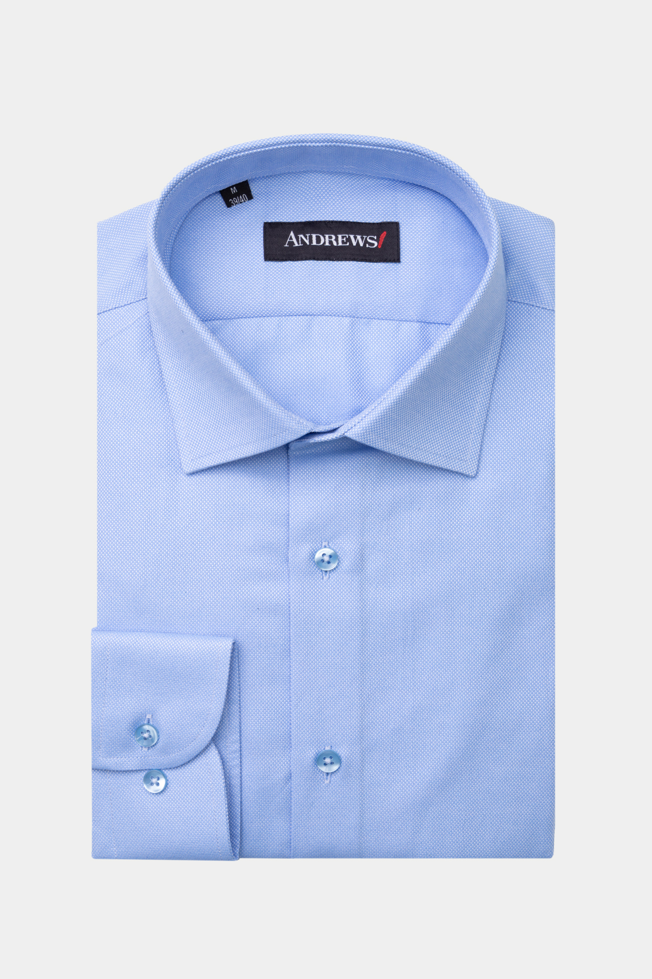 Мъжка бизнес риза. Материята е с фина структура. Права кройка. Светъл син цвят. Състав : 55 % памук, 45 % полиестер
