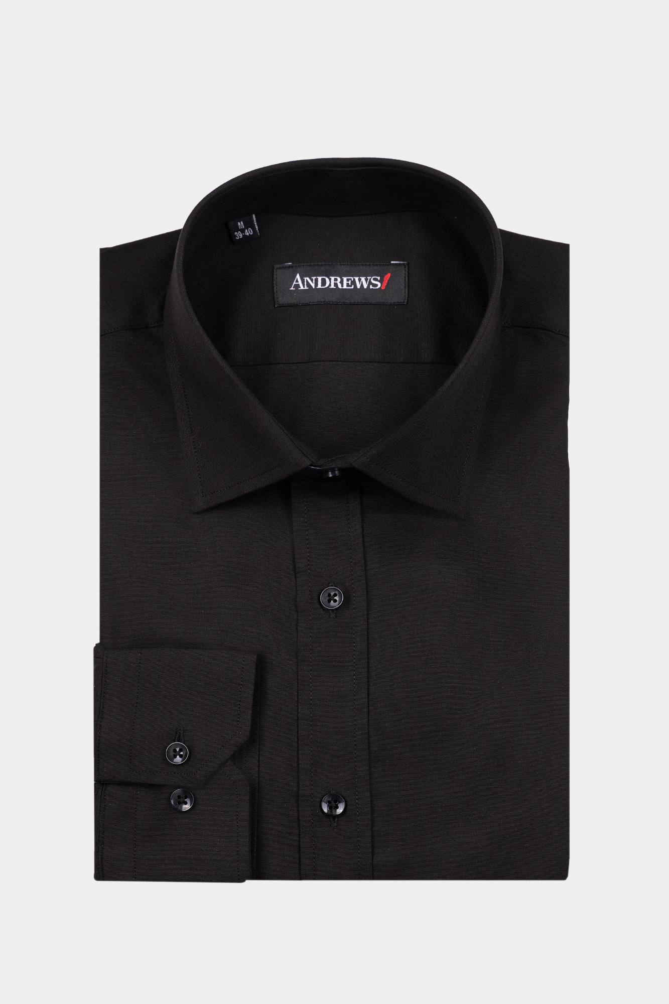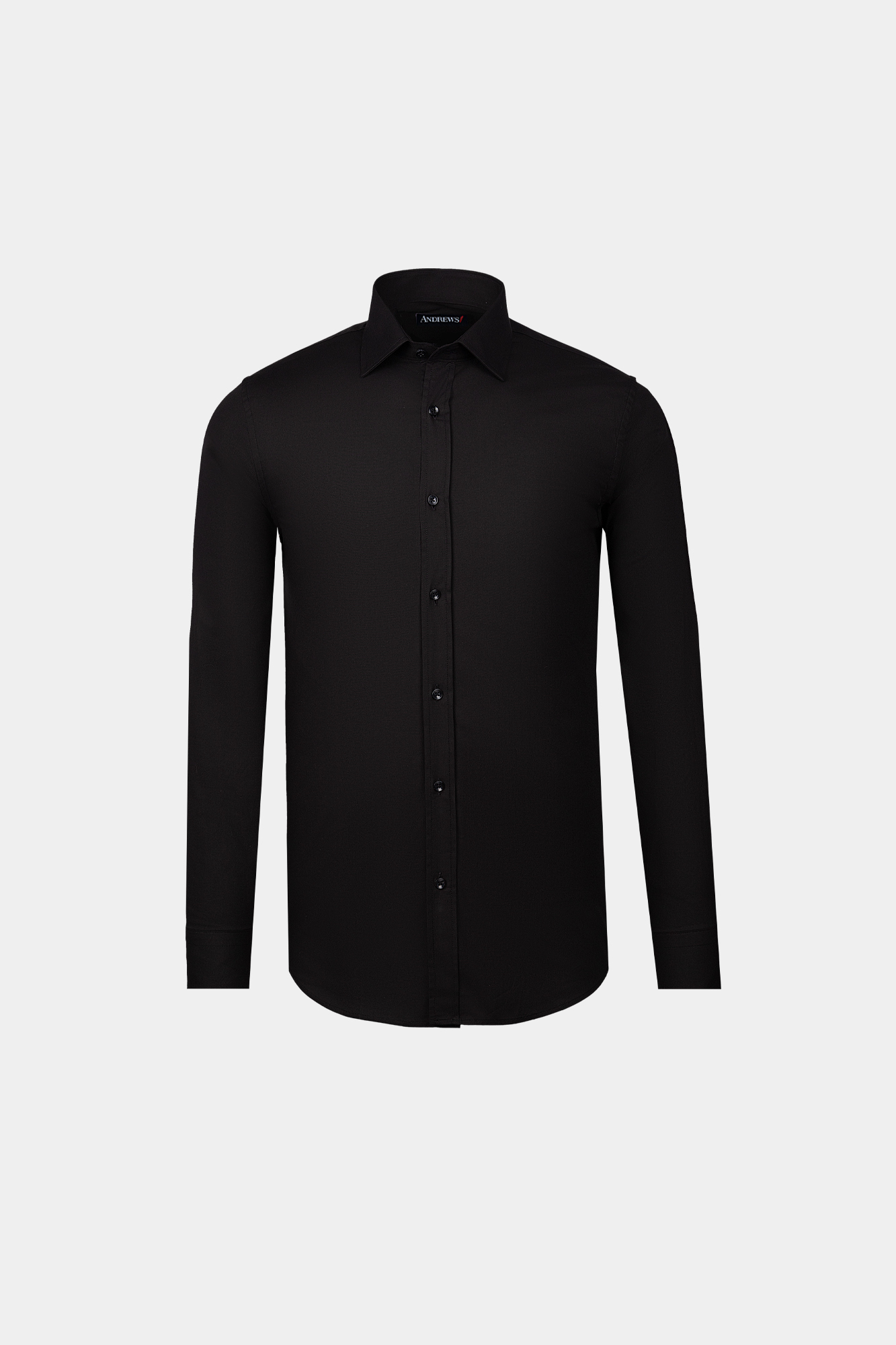 Черна бизнес риза. Вталена кройка. Комбинацията от памук и еластан я прави мека и нежна на допир и достатъчно удобна и даваща свобода на движенията. Подходяща за сезон пролет / лято. Състав : 97 % памук, 3 % еластан