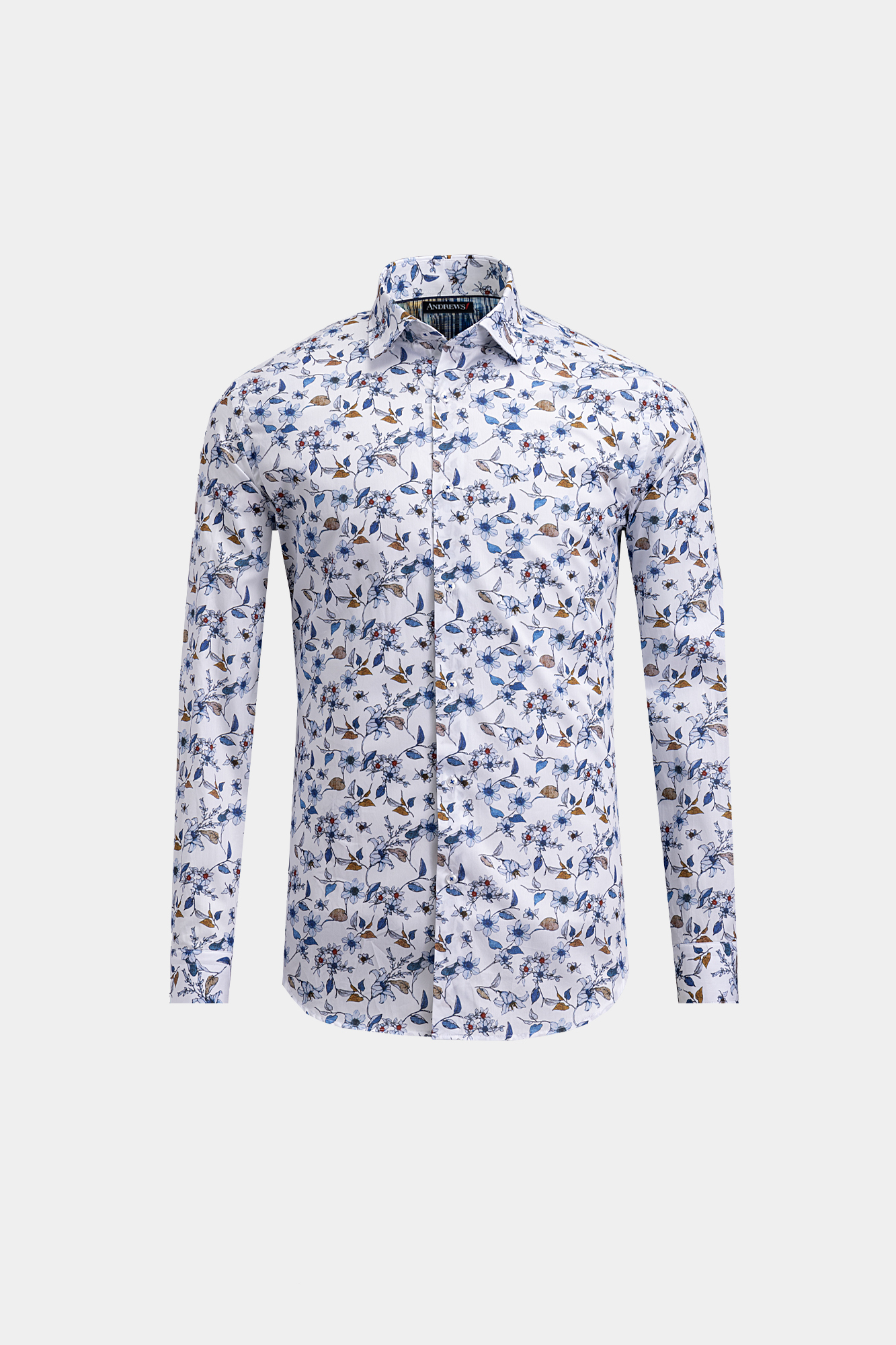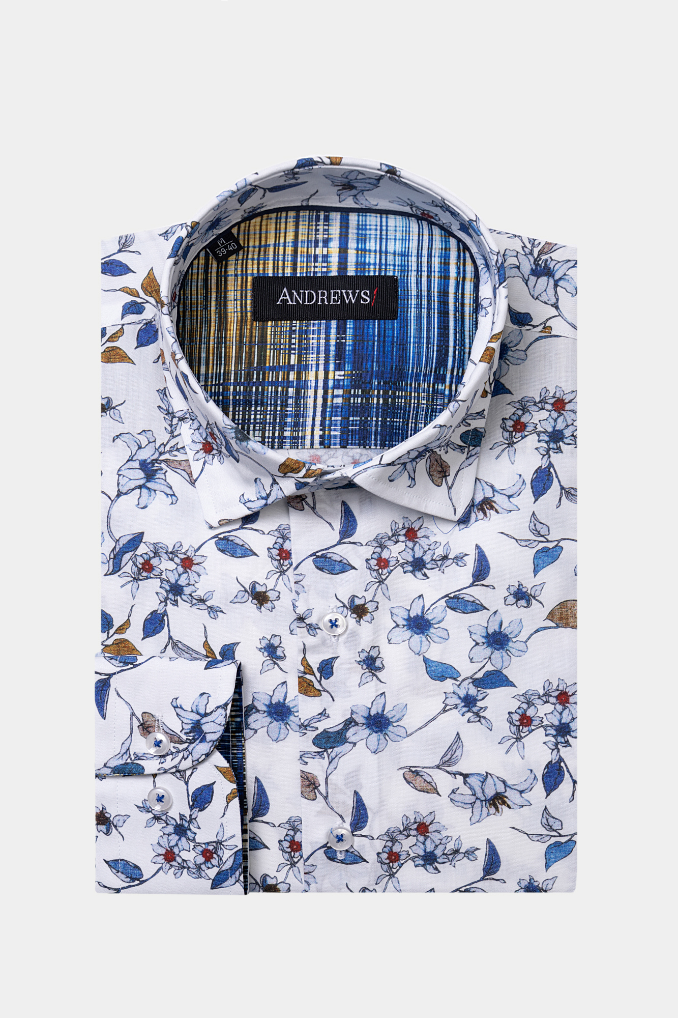 Мъжка риза с нежен флорален принт върху бяла основа. Вталена кройка с по-широки рамене. Ежедневен стил. Сезон пролет / лято. 100 % памук