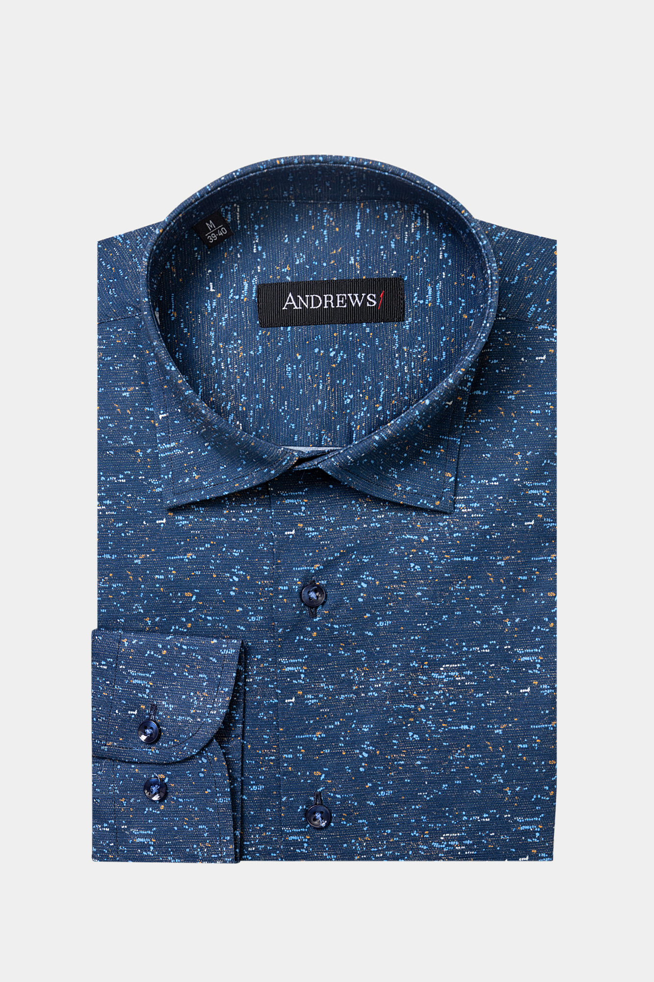 Кежуал риза. Тъмносин цвят на ситни цветни пръски. Вталена кройка с по-широки рамене. Сезон пролет / лято. Състав : 97 % памук, 3 % еластан