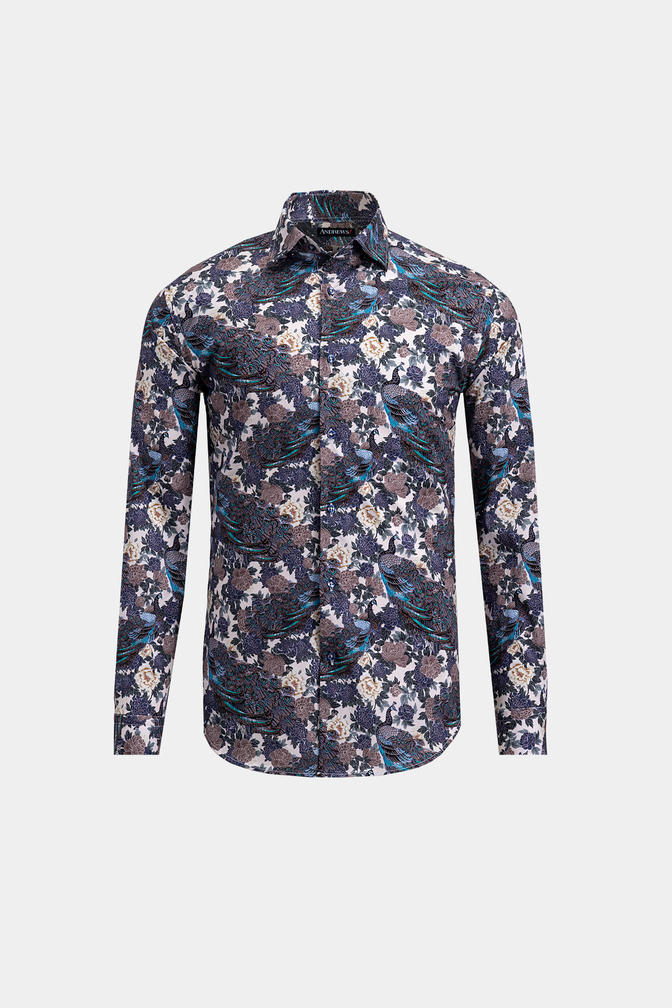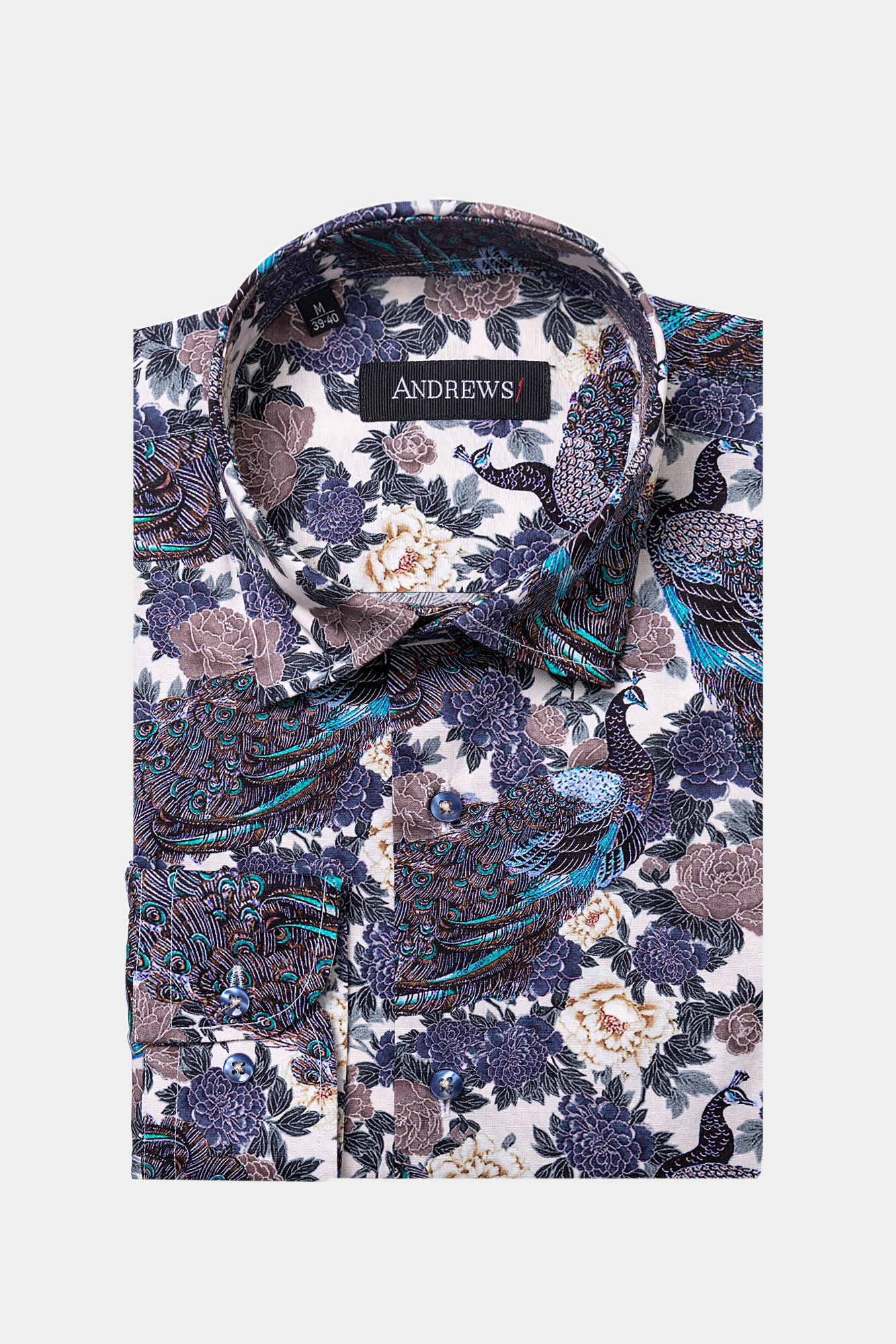 Спортно-елегантна риза с принт на птици. Вталена кройка с по-широки рамене. Подходяща за сезонн пролет / лято. Състав : 97 % памук, 3 % еластан. Модерна и атрактивна визия в комбинация с удобство и гъвкавост