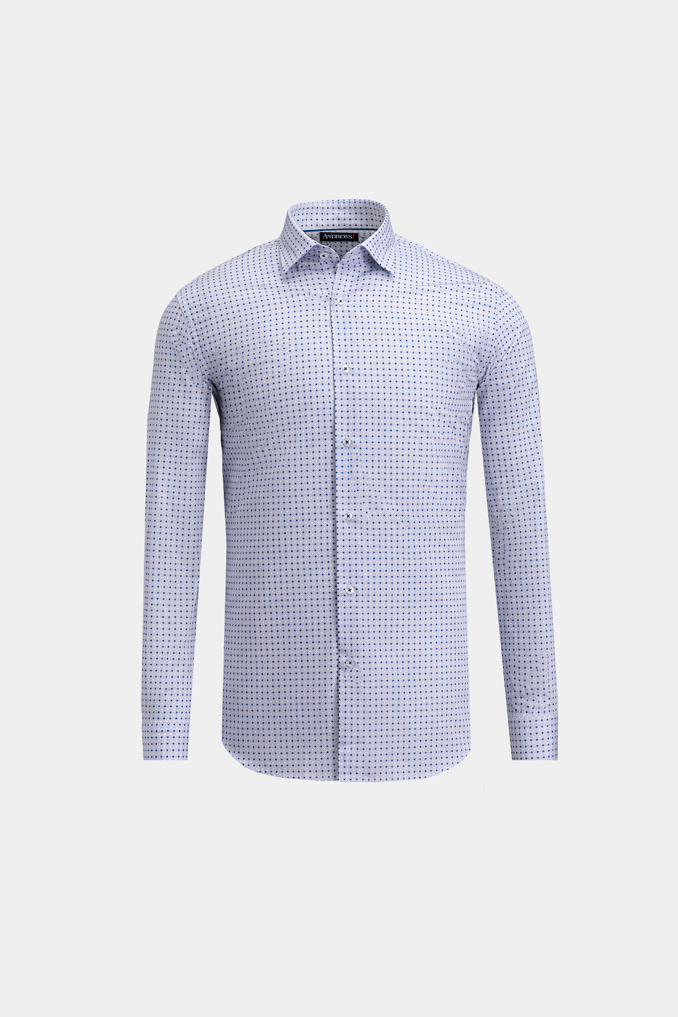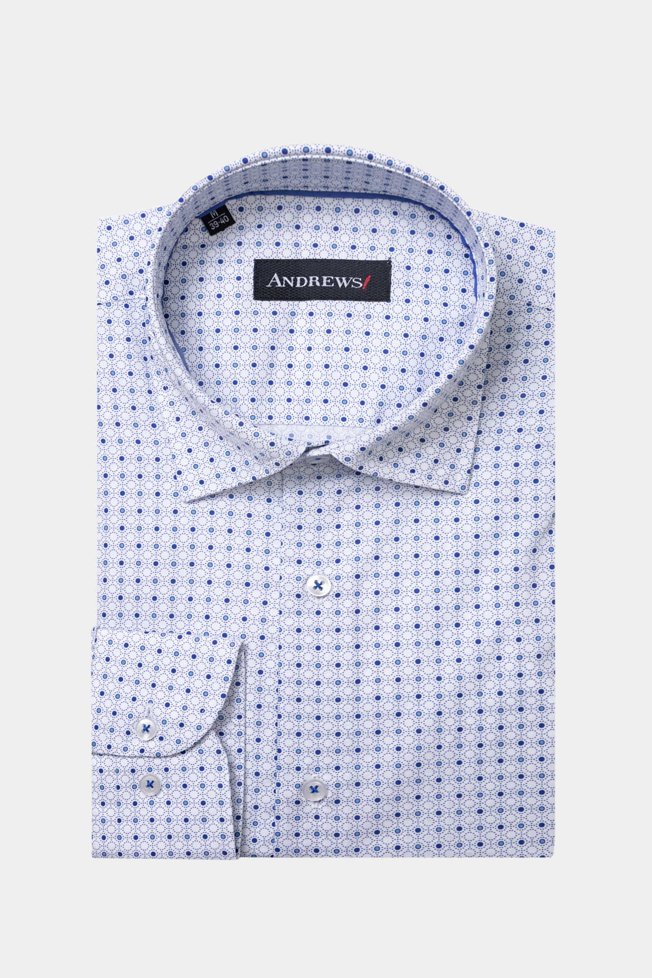 Спортно-елегантна риза на точки. Вталена кройка с по-широки рамене. 100 % памук. Цвят : мави/сакс. Подходяща за сезон пролет / лято