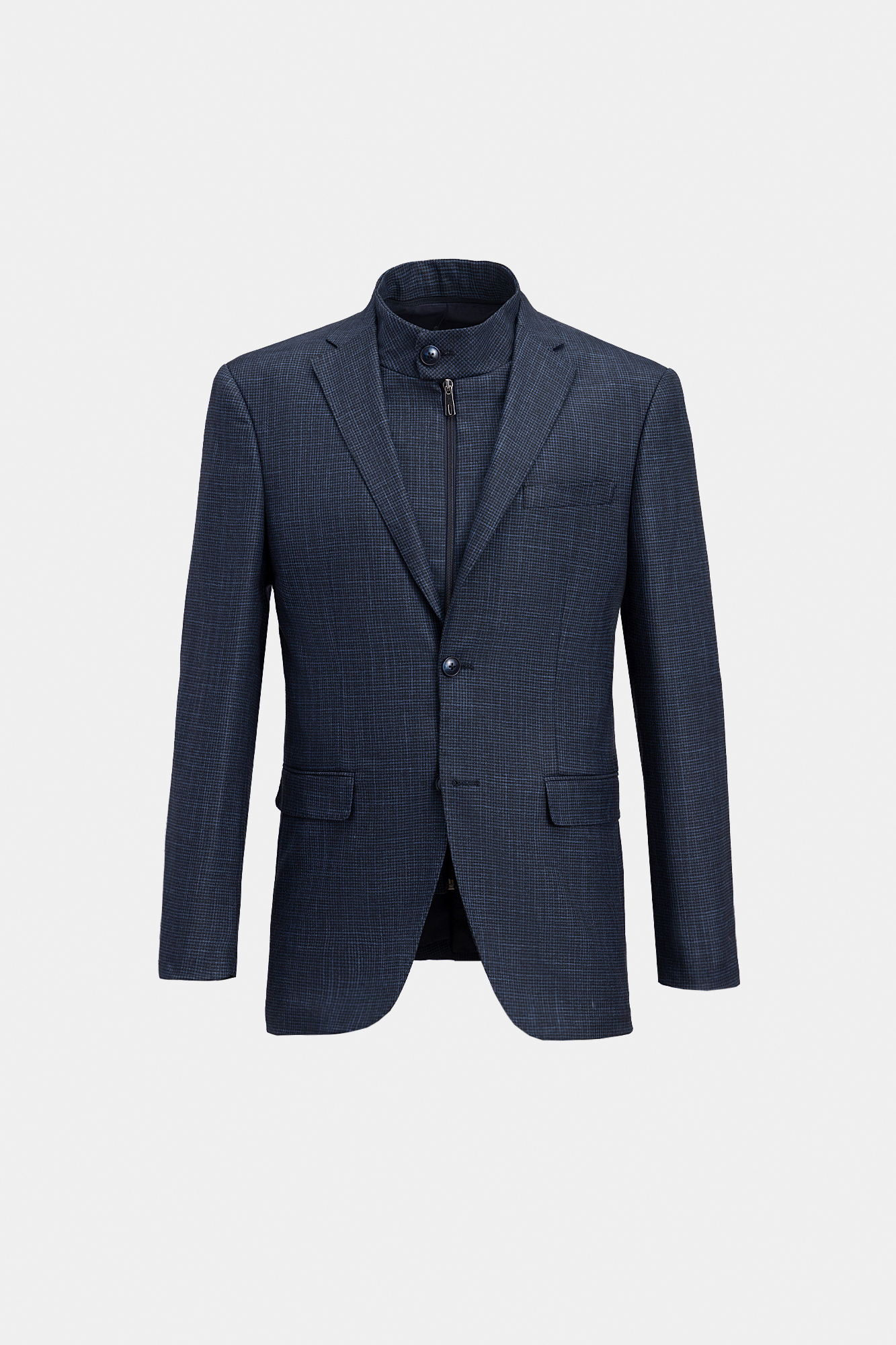 Спортно-елегантно сако със сваляща се петурина. Допълнително копче на яката. Ситен син пепит. Два джоба с капак и един джоб на гърдите. Сезон есен / зима. Състав : 64 % полиестер, 34 % вискоза, 2 % еластан