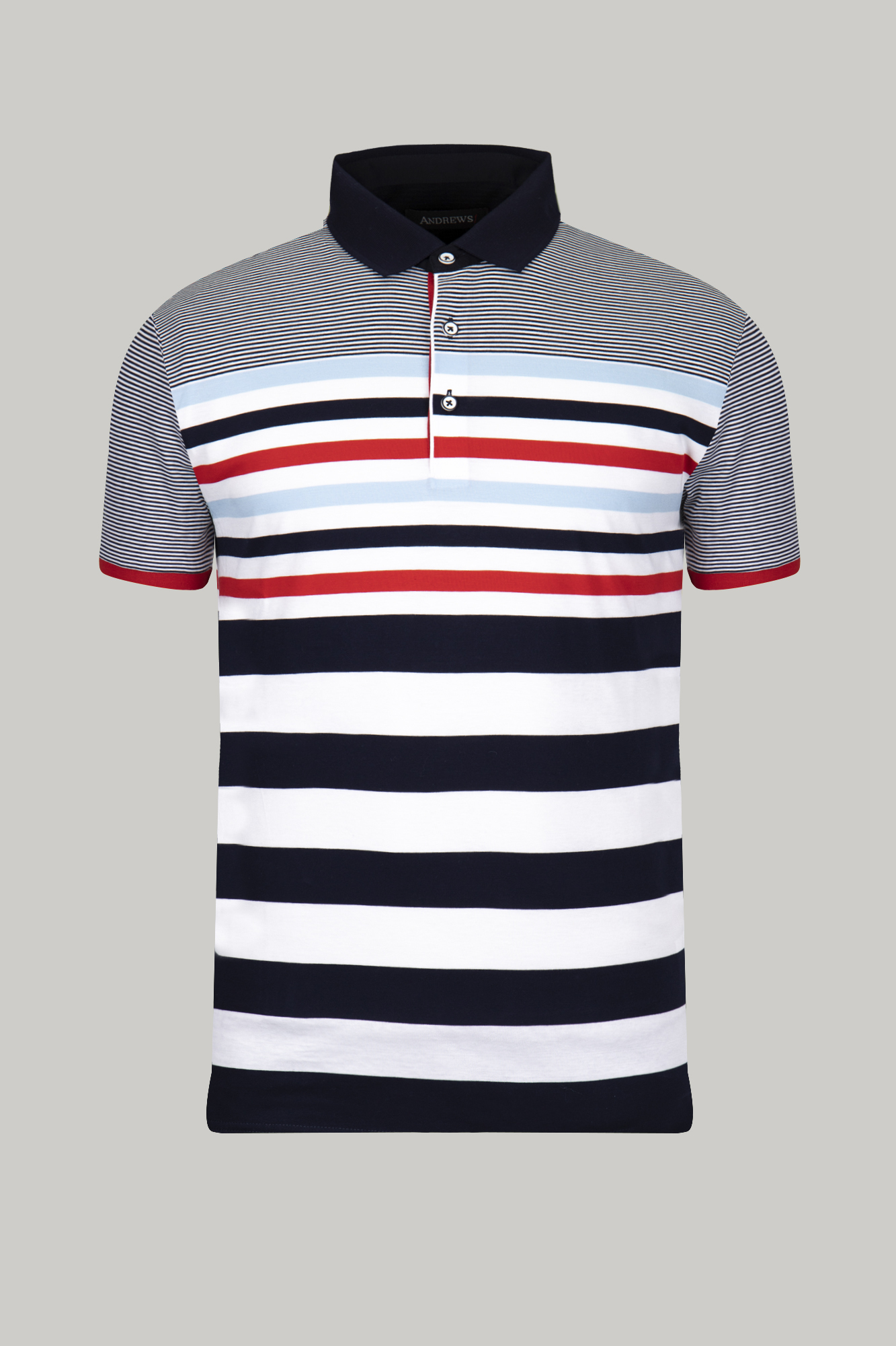 Мъжки тишърт с къс ръкав. Комбинация от едро и ситно райе в син и червен цвят. Тъмносиня яка. 100 % памук