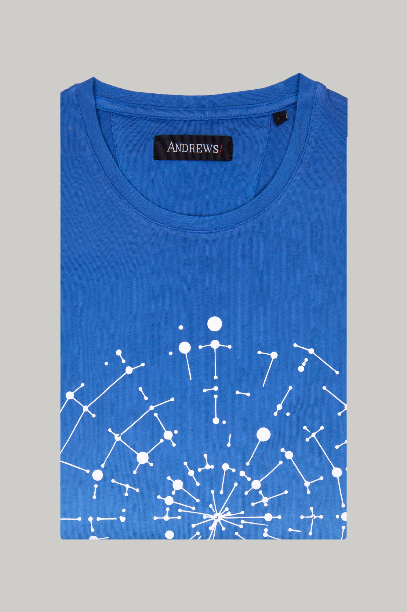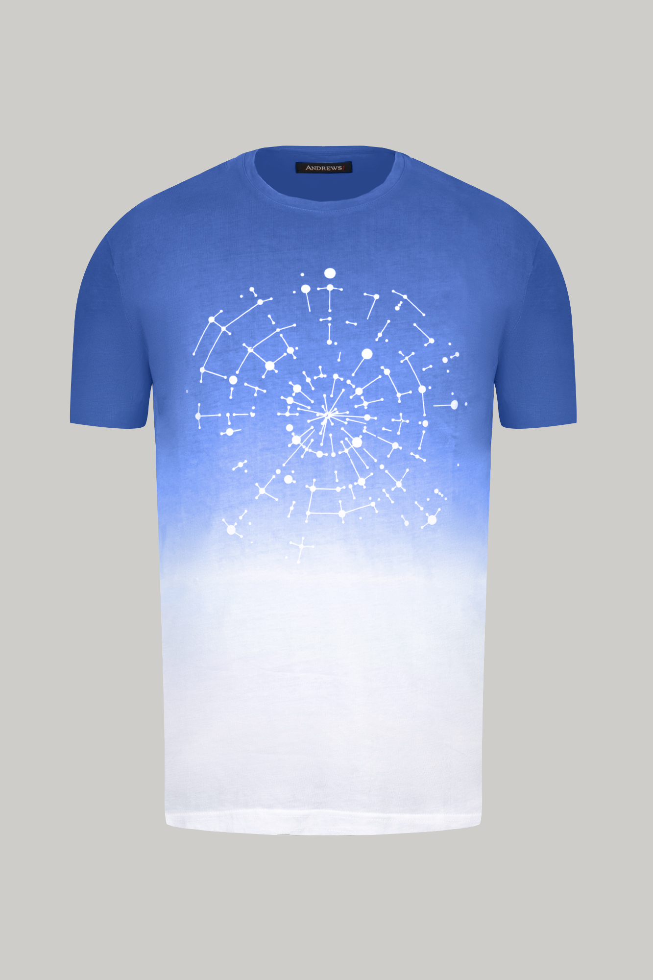Тениска с ефектно преливащи цветове сакс и бял. Симетричен принт на пръски. 100 % памук