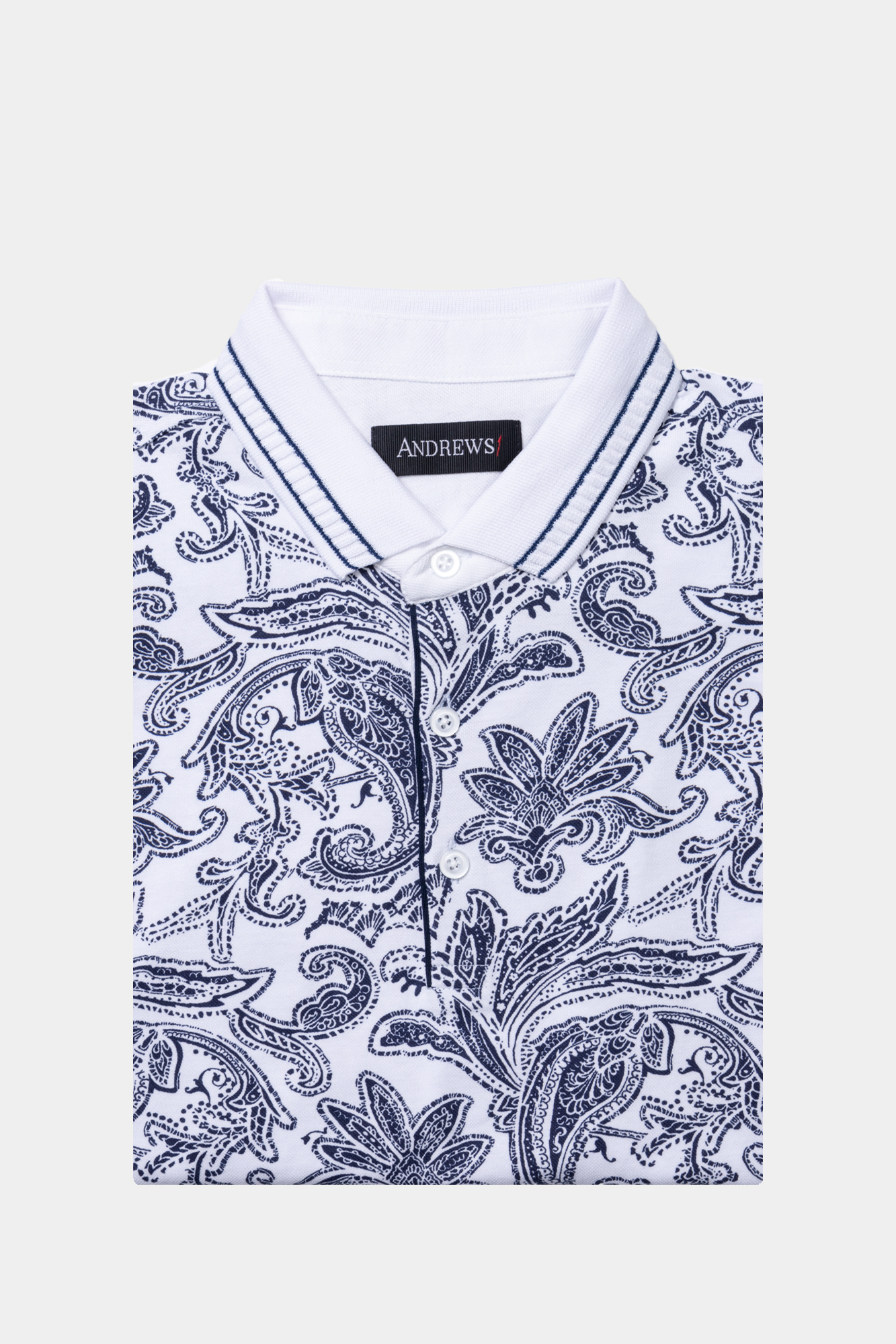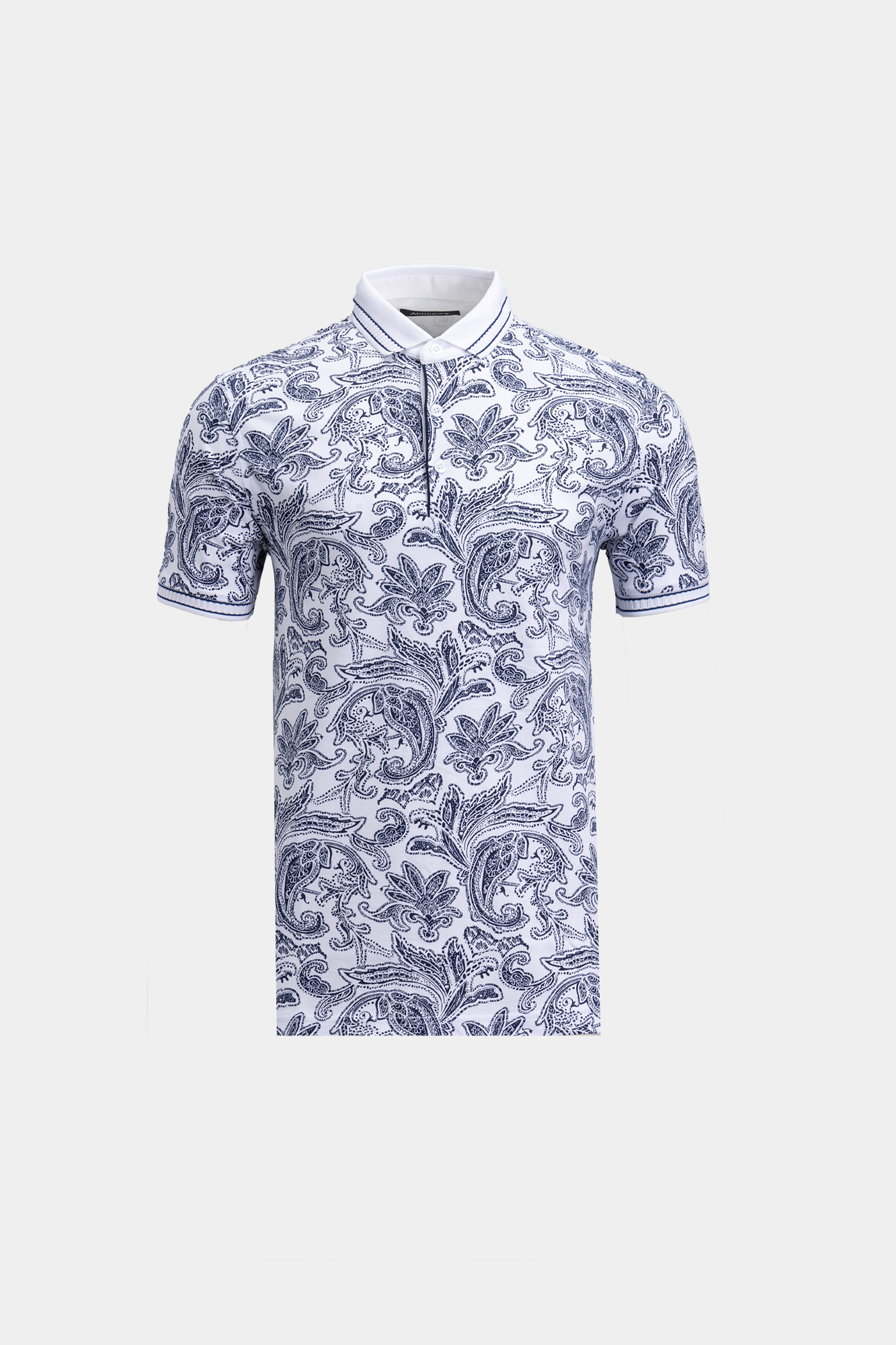 Мъжки тишърт с къс ръкав. Принт с тъмни пейсли елементи върху бяла основа. Бяла якичка с гарнитура. Състав : 95 % памук, 5 % еластан