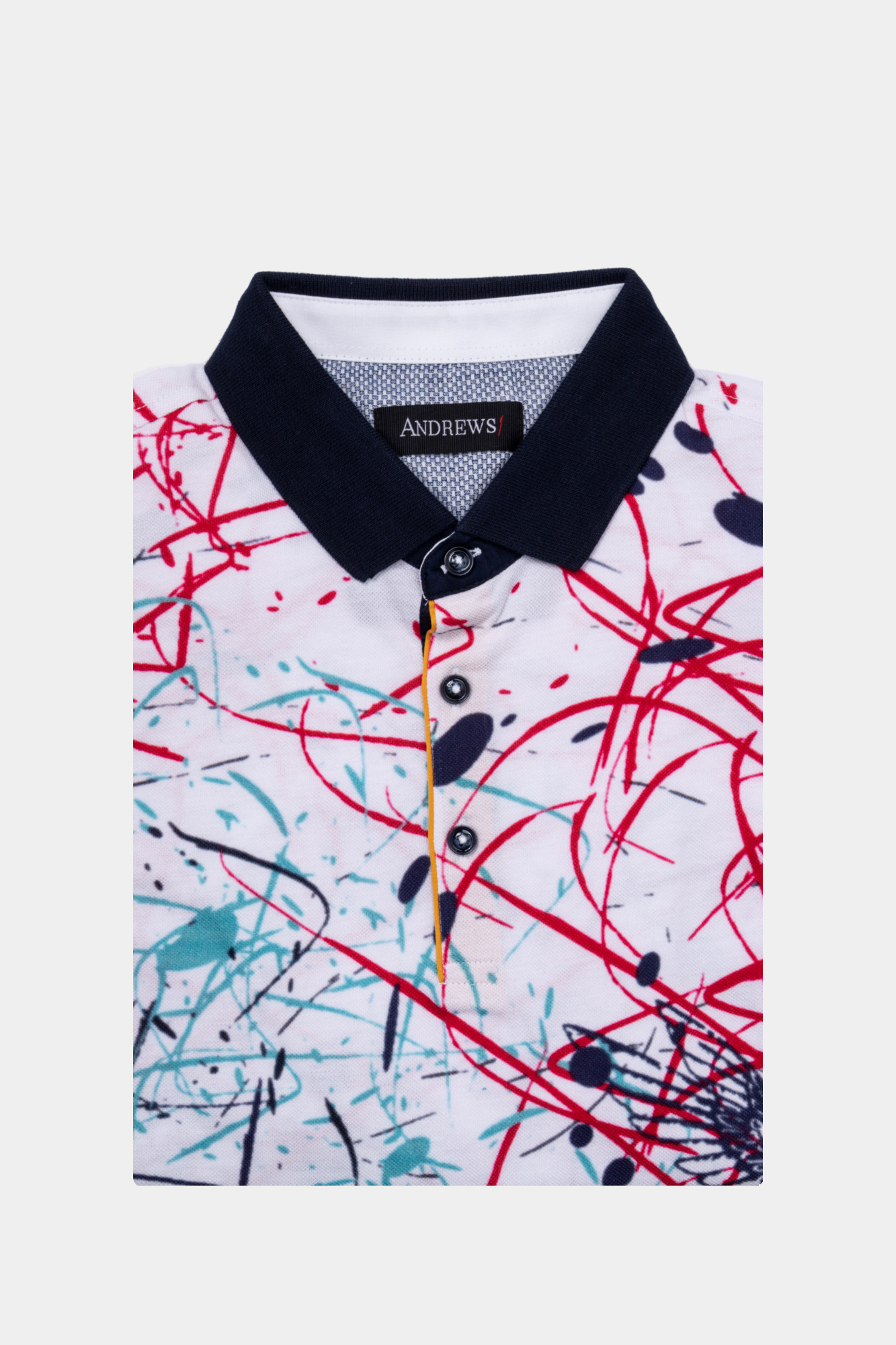 Мъжки тишърт с къс ръкав. Многоцветен абстрактен принт с птици върху бяла основа. Контрастна якичка и контрастен завършек на ръкавите. 100 % памук
