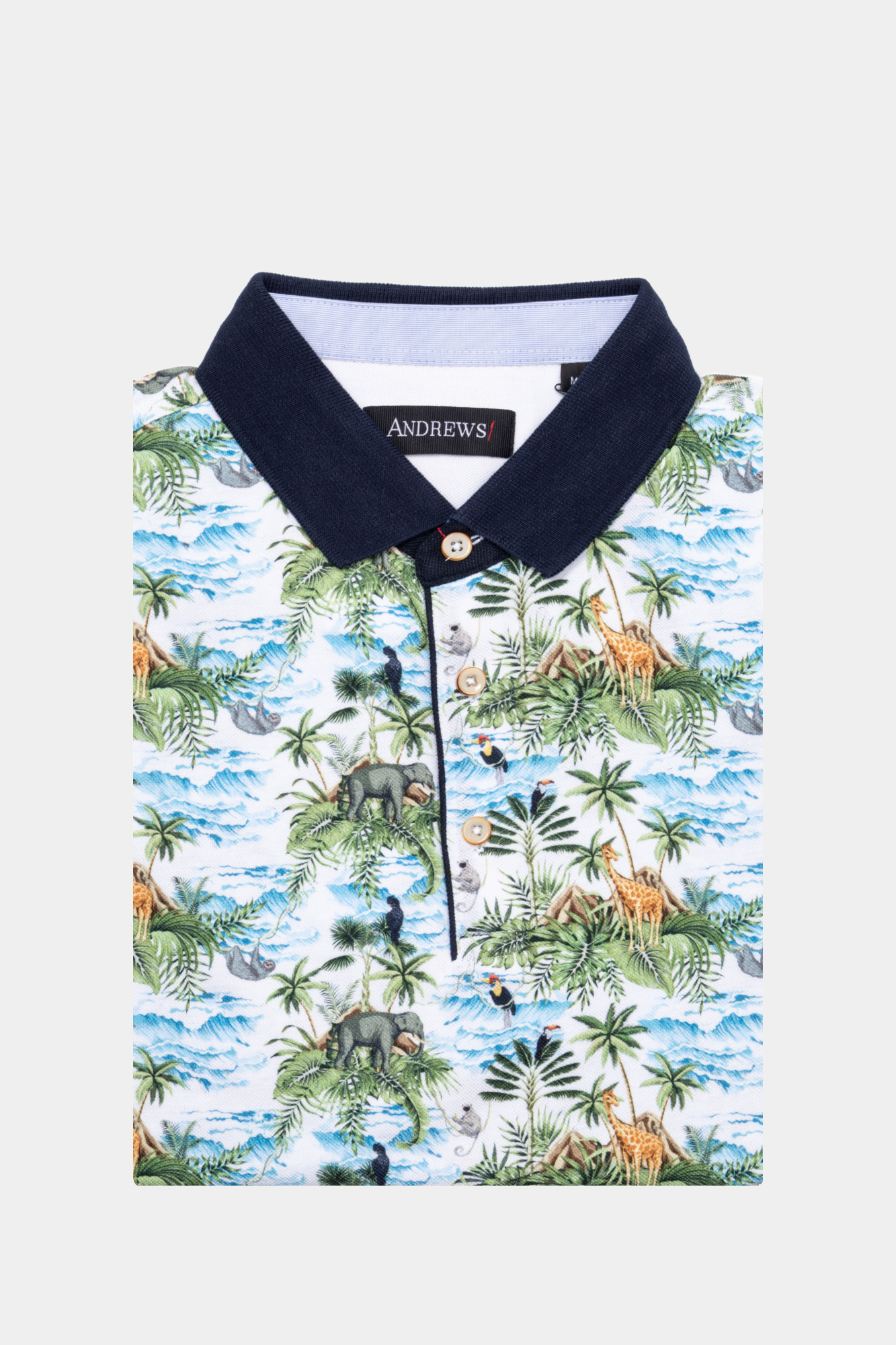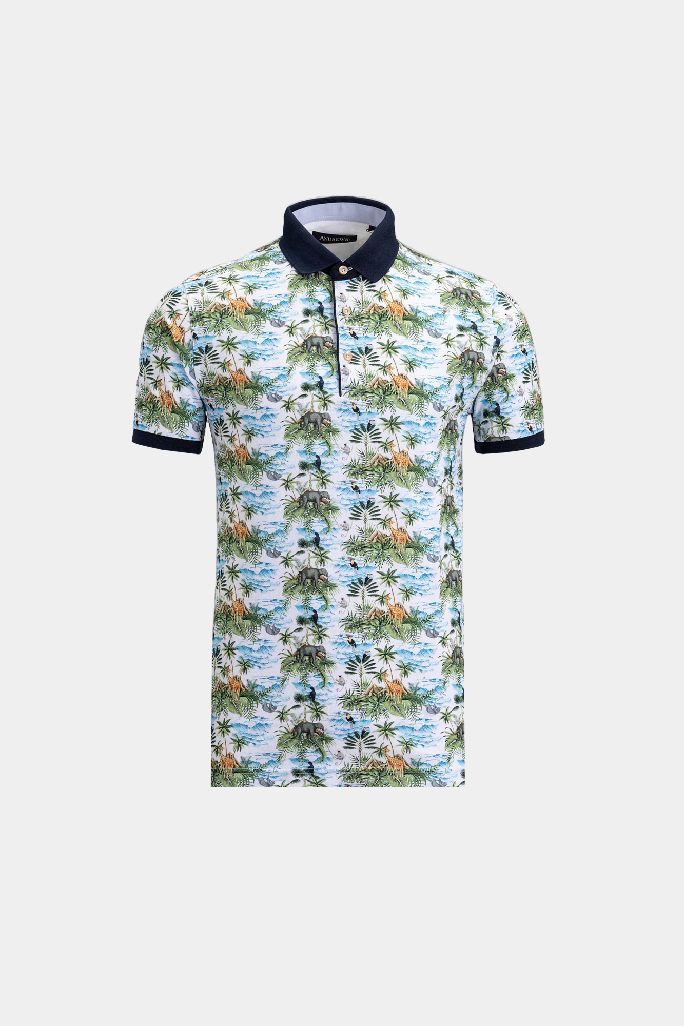 Мъжки тишърт с къс ръкав. Интересен животински принт в цветовете зелено/синьо/оранжево. Контрастна якичка и контрастен завършек на ръкавите. 100 % памук