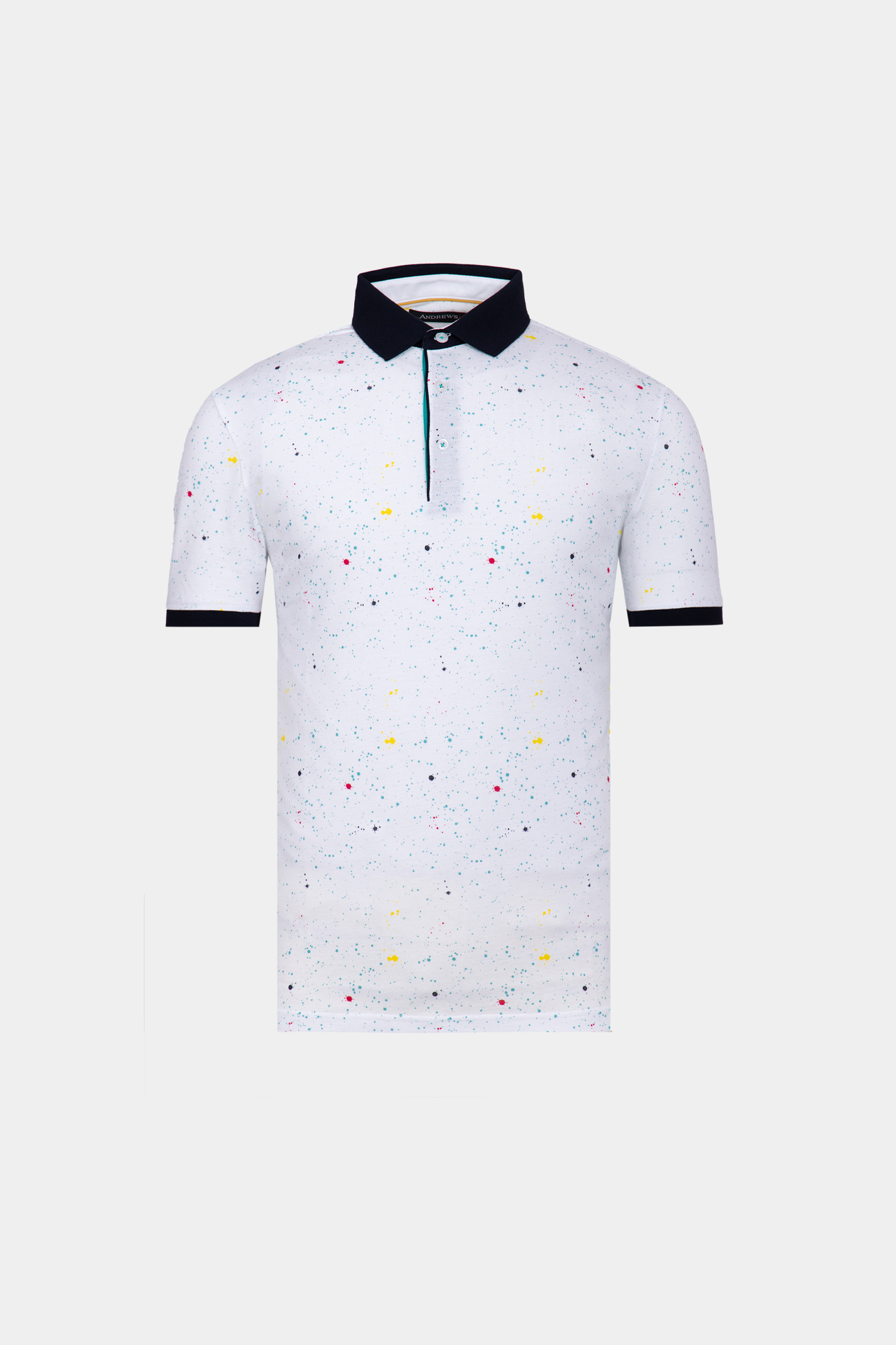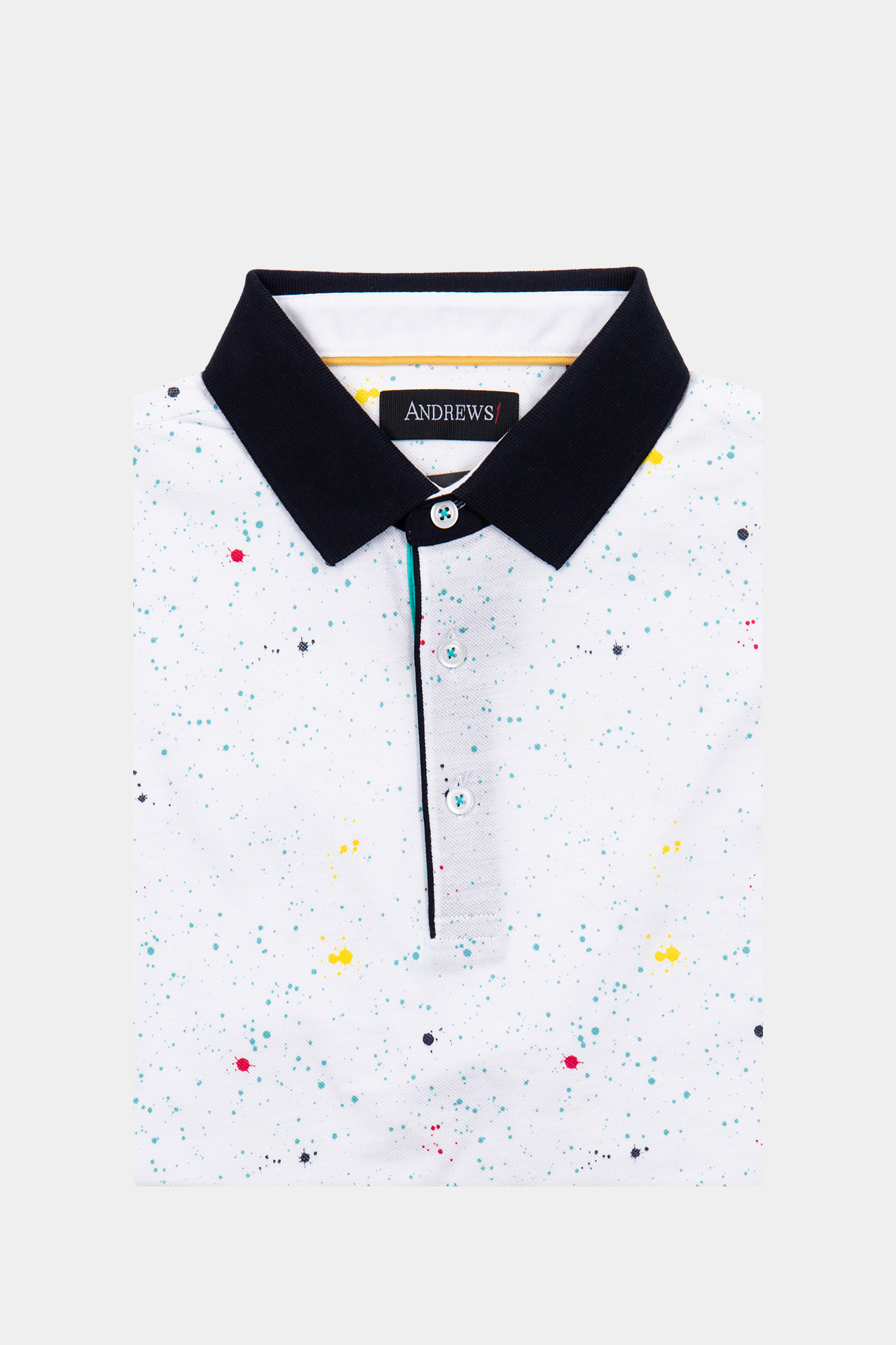 Бял тишърт с ефект на цветни пръски. Къс ръкав. Контрастна черна яка. Черен завършек на ръкавите. Състав : 100 % памук