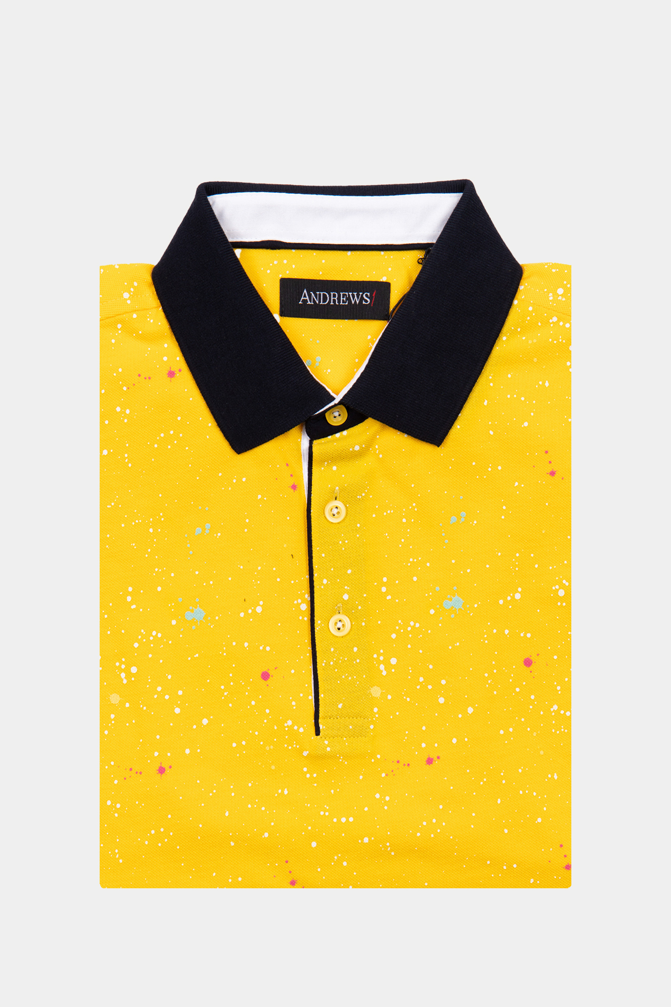 Жълт тишърт с напръскан ефект на цветни точки. Къс ръкав. Контрастна черна яка. Черен завършек на ръкавите. Състав : 100 % памук