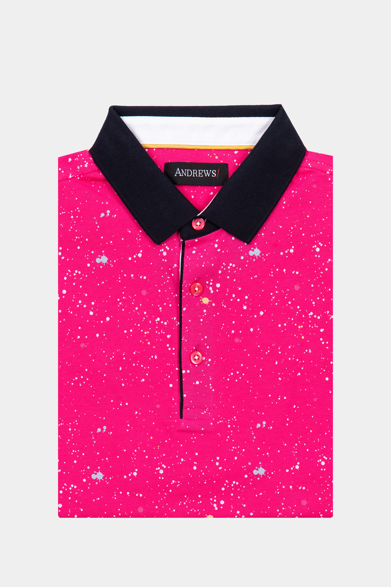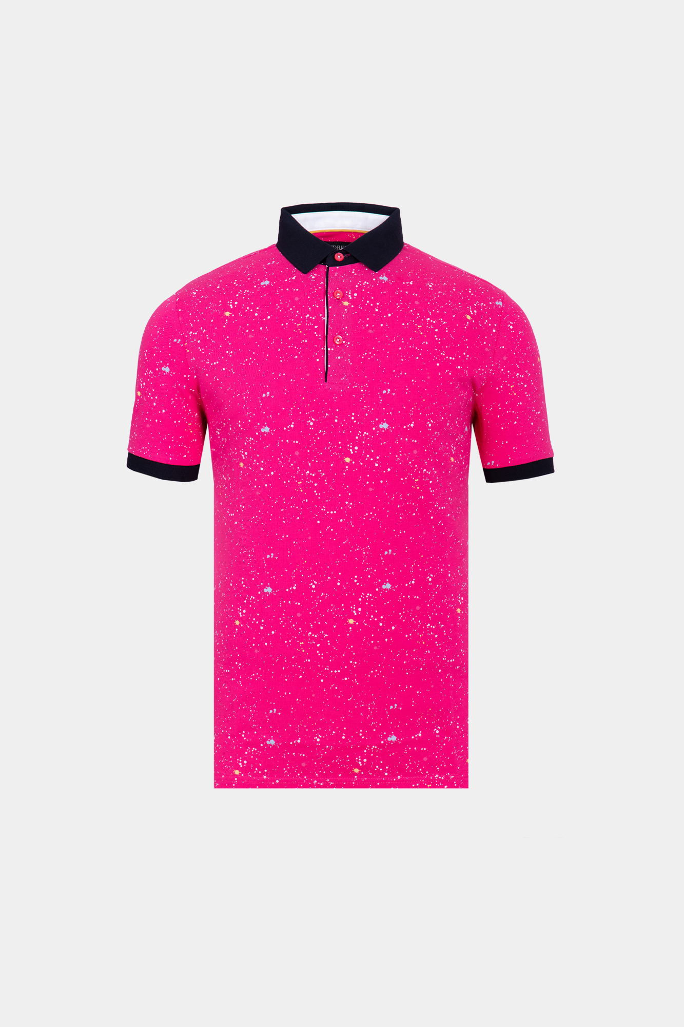 Розов тишърт с напръскан ефект на цветни точки. Къс ръкав. Контрастна черна яка. Черен завършек на ръкавите. Състав : 100 % памук