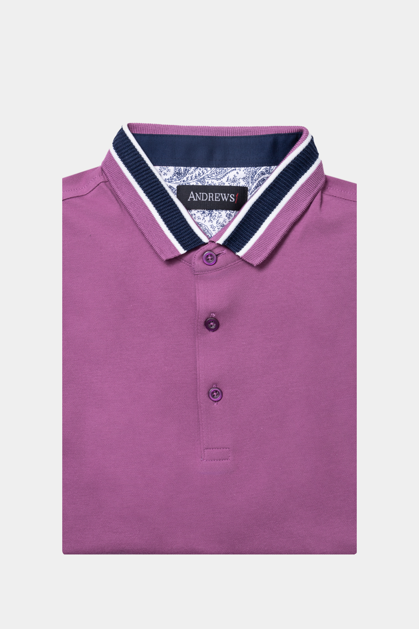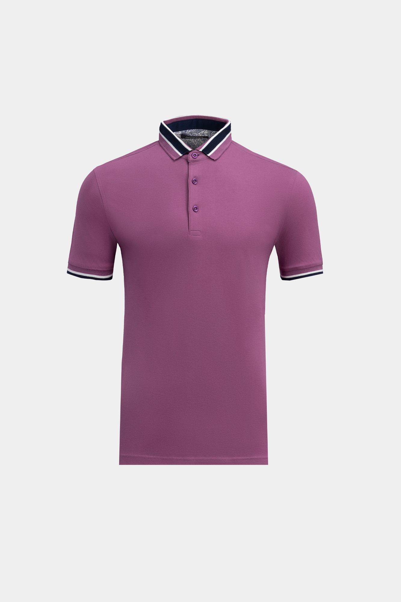 Мъжки тишърт с къс ръкав. Цвят лилав, с контрастна гарнитура на яката и ръкавите. Закопчаване с три копчета. Състав : 95 % памук, 5 % еластан