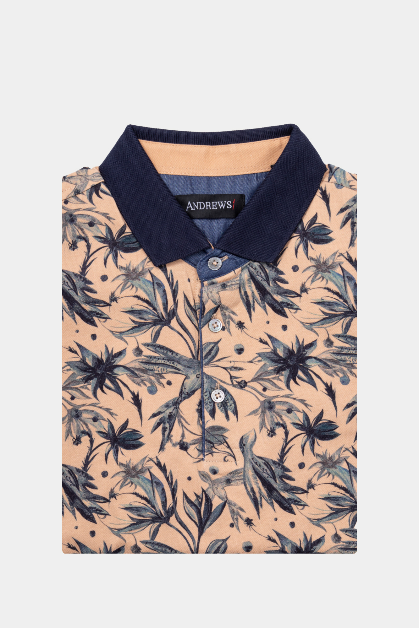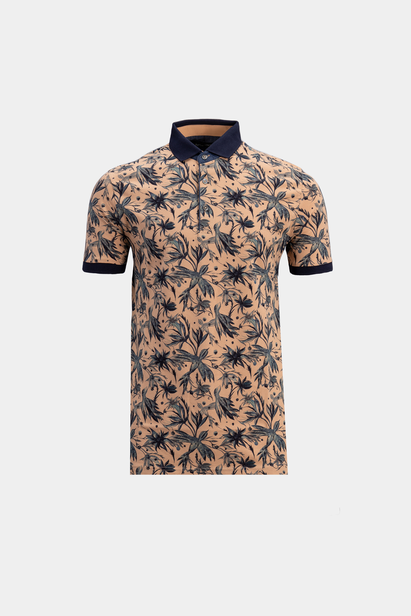 Бежов тишърт с къс ръкав. Зелен флорален принт. Контрастна яка и контрастен завършек на ръкавите. Сезон пролет / лято. Състав : 95 % памук, 5 % еластан
