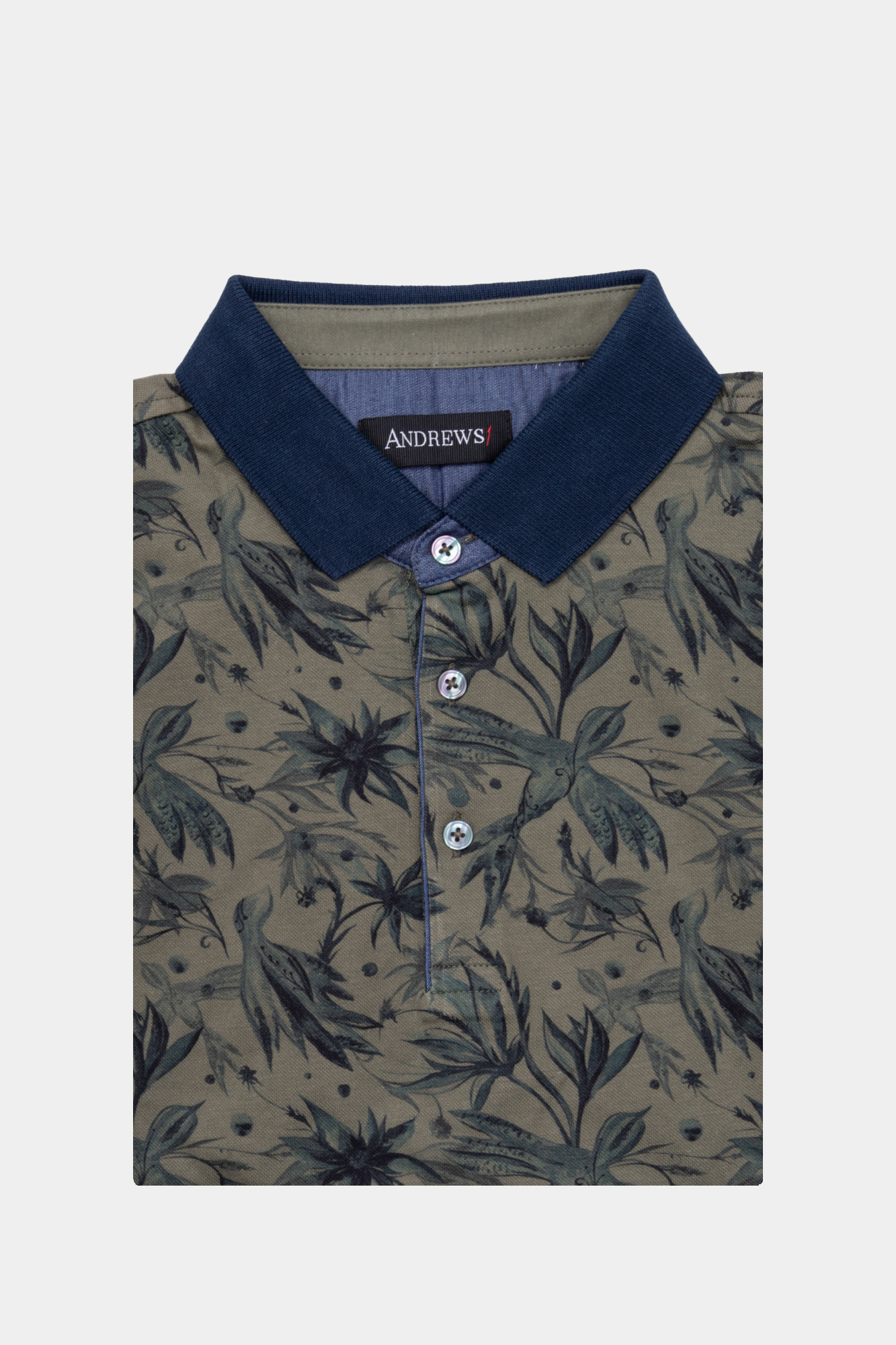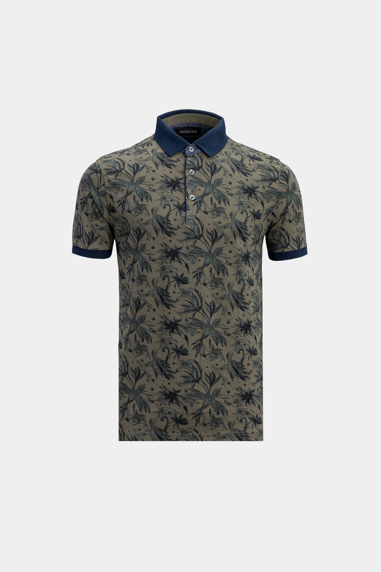 Тишърт с къс ръкав. Цвят хаки. Тъмен флорален принт. Контрастна яка и контрастен завършек на ръкавите. Сезон пролет / лято. Състав : 95 % памук, 5 % еластан