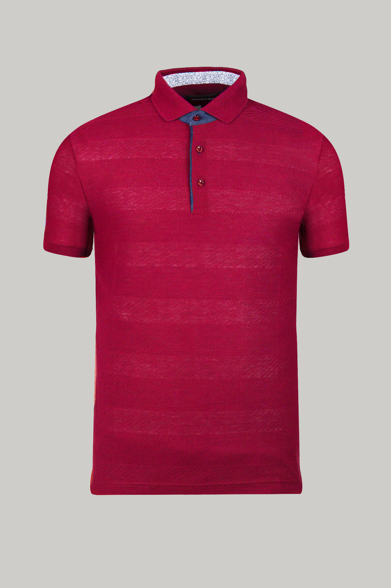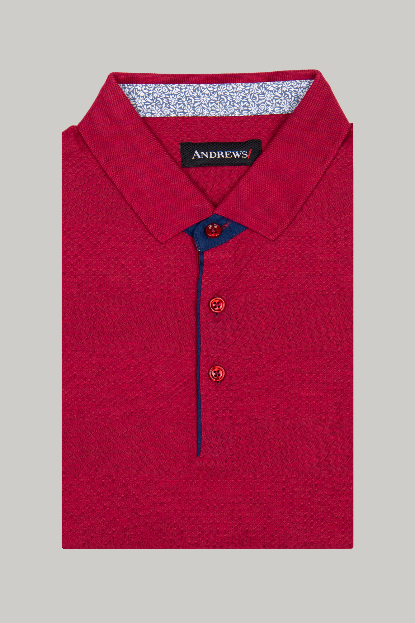 Спортно-елегантен тишърт с якичка. Жакард. Цвят бордо с контрастна синя гарнитура. Закопчаване с три копчета. Ластичен завършек на ръкавите. Състав : 67 % полиестер, 33 % вискоза