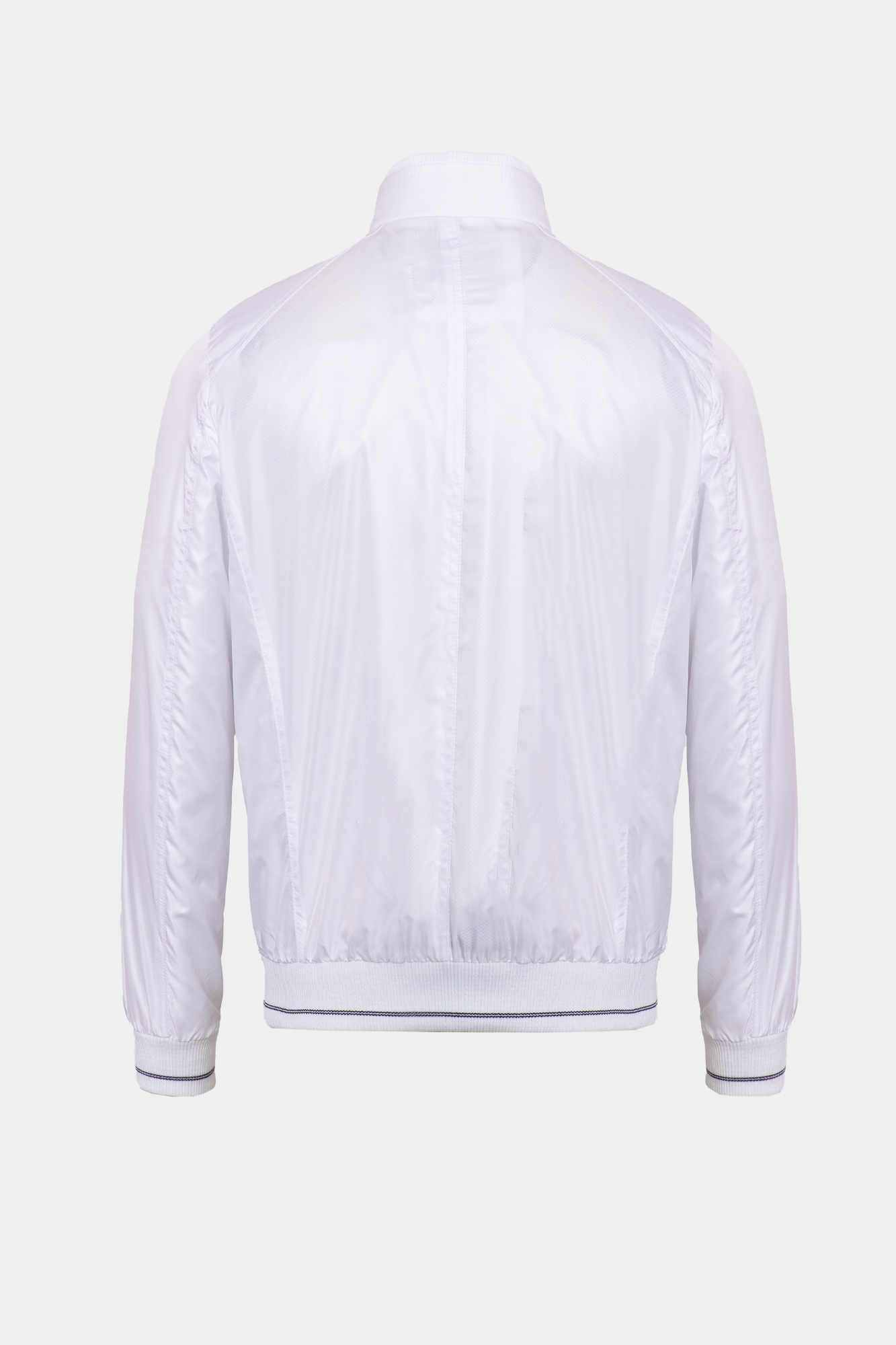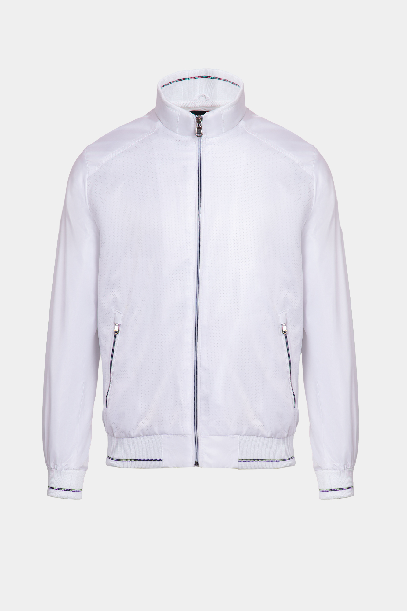 Леко ежедневно яке, подходящо за пролетно-летния сезон. Бял цвят. Контрастен черен цип и контрастна гарнитура на талията и маншетите. Ветроустойчиво и дишащо. Два странични джоба с цип и два вътрешни джоба с цип. Многоцветен мрежест хастар. Ластик на яката, на талията и маншетите. 100 % полиестер